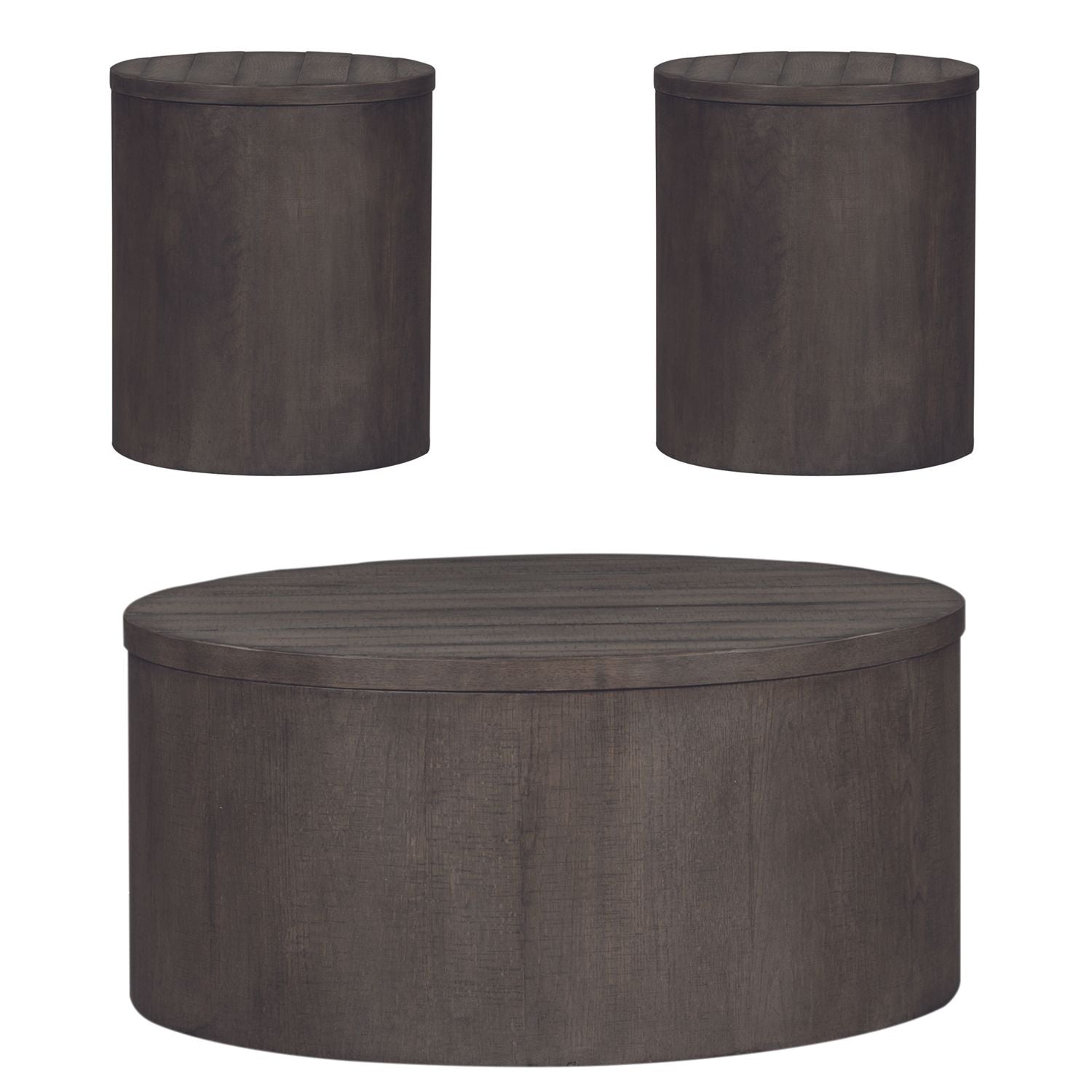 Elevate your space with the Modern Farmhouse drum cocktail table and end tables. Crafted of poplar solids with knotty white oak veneers, features a dusty charcoal finish with heavy distressing, an appealing high-low planked top, and casters for easy moveability. End table features a removable top for hidden storage. Enjoy family game night or have your favorite snack with it spacious design. Kit includes one drum cocktail and two drum end tables. Also available in flea market white finish.