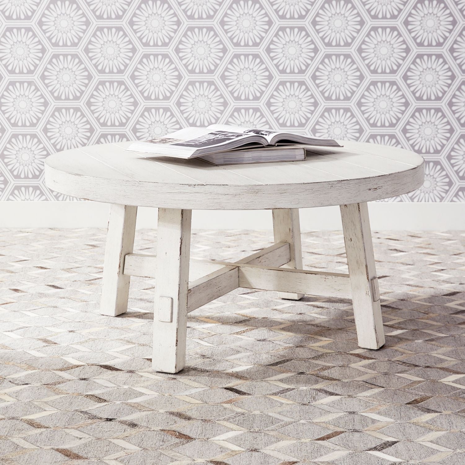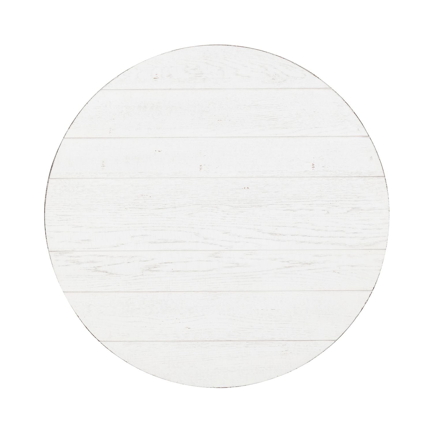Accent your space with the Modern Farmhouse splay leg round cocktail table. Crafted of poplar solids with knotty white oak veneers, this piece features a dusty flea market white finish with heavy distressing, appealing high-low planked top, anchored by a splayed leg design. Also available in an alternate finish, this modern farmhouse piece would be a wonderful addition to your cottage or contemporary style space.