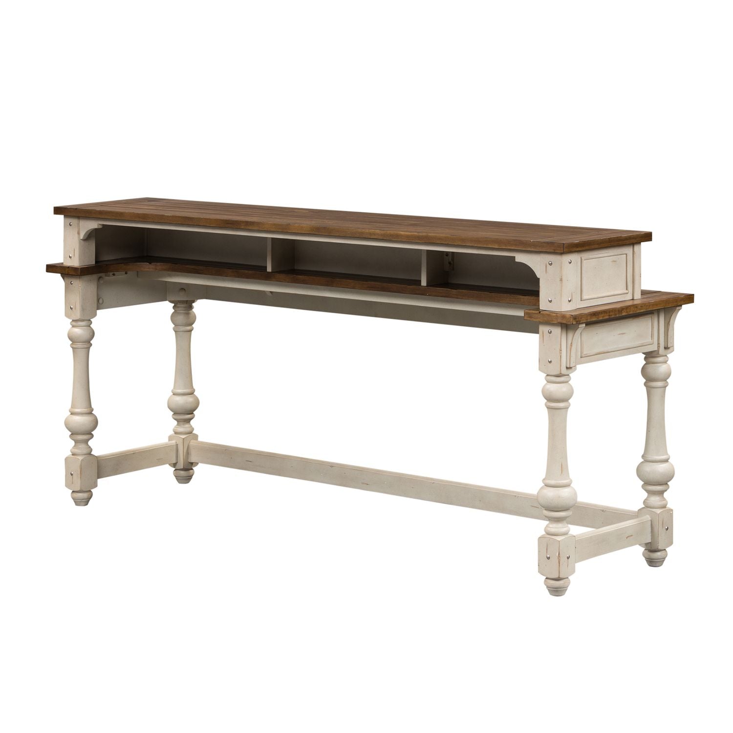 Accent your space with the Morgan Creek console bar table. Crafted of poplar solids with pine and birch veneers, this piece features an antique white finish with spatter and watermark accents with a wire brushed tobacco planked top, appealing pewter nail head corner accents, three cubbies for additional storage, anchored by round turned legs. This one-of-a-kind console bar table will bring a warm luxurious feel to any traditional space, perfect for behind your sofa.