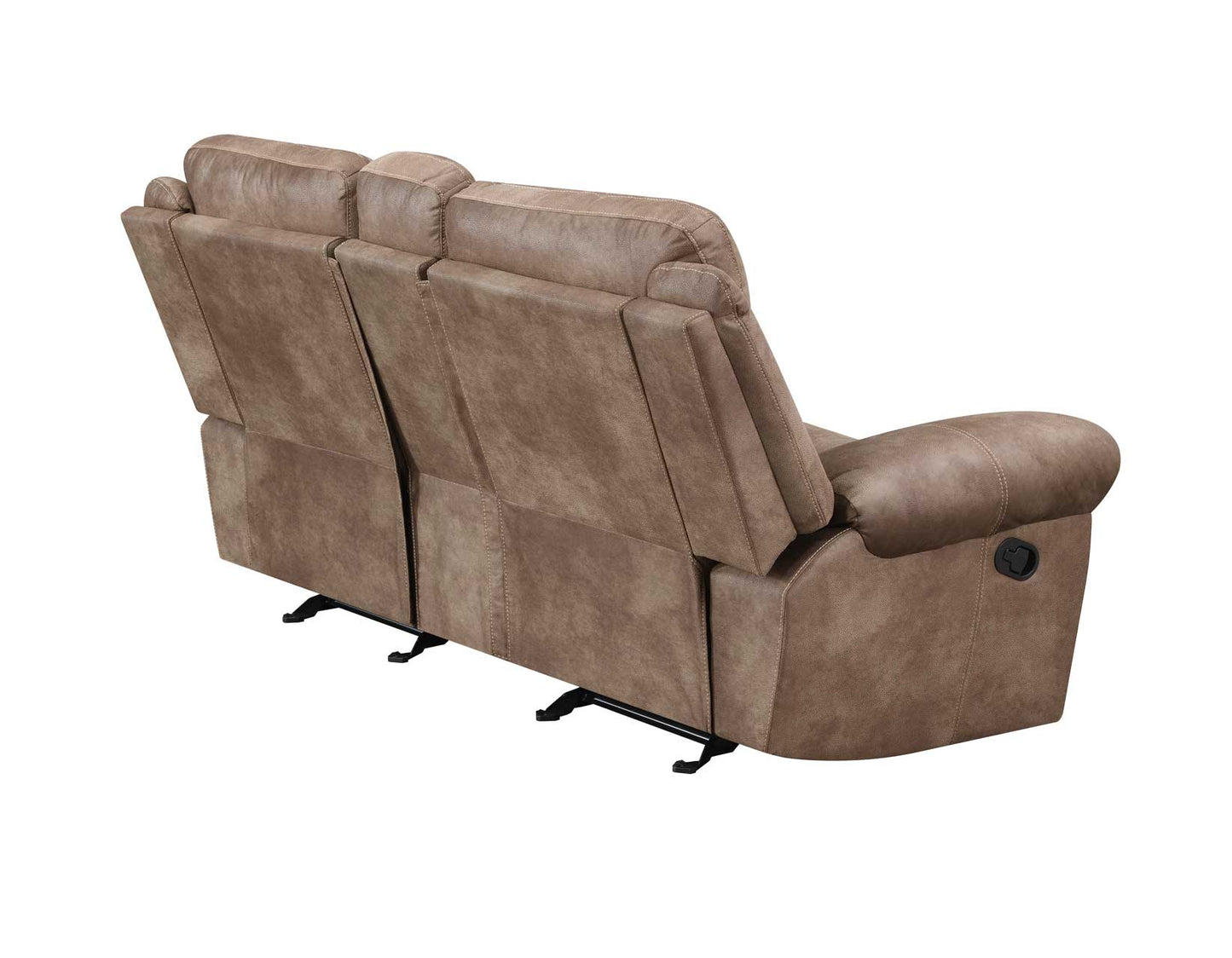 The Nashville Cocoa Glider Recliner Console Loveseat brings incredible comfort to a room whether reclined or closed. The built-in Glider mechanism adds a comforting gliding motion to each seat while the outside manual lever puts you in a full recline at the flip of a switch. The faux-suede cover is soft to the touch and warms up the room with its cocoa colored cover. Generous arms in an overlapping design add ample padding to complement the lavish seat cushioning for a relaxing reclining experience.