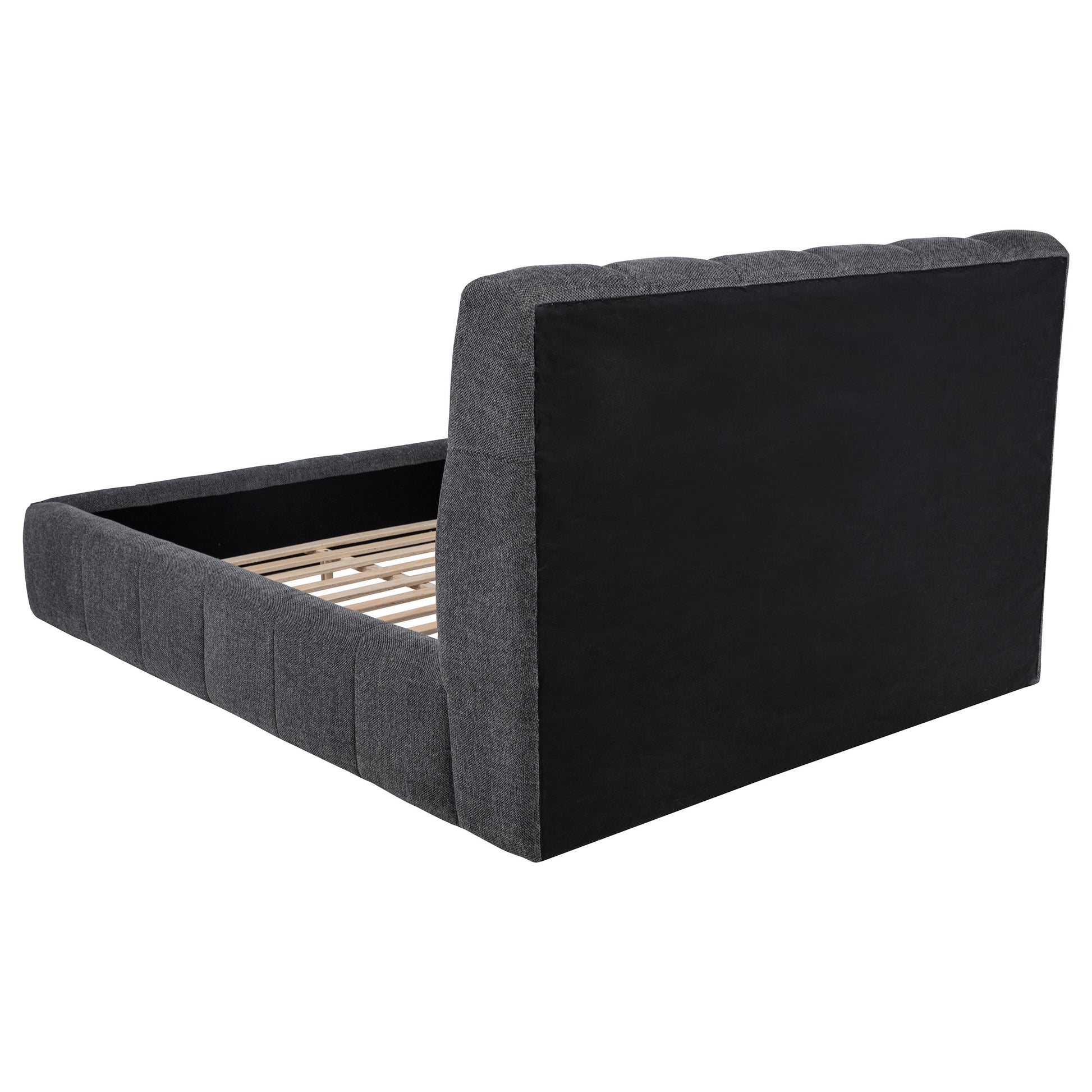 Tailored with bold lines and soft texture, this upholstered platform bed blends comfort with quiet strength. Vertical channel tufting runs along the headboard and foot rails, adding dimension and rhythm to the silhouette. Wrapped in plush fabric and fully slatted for support, it eliminates the need for a foundation. Crafted from solid and engineered wood, this bed invites modern serenity into any bedroom retreat.