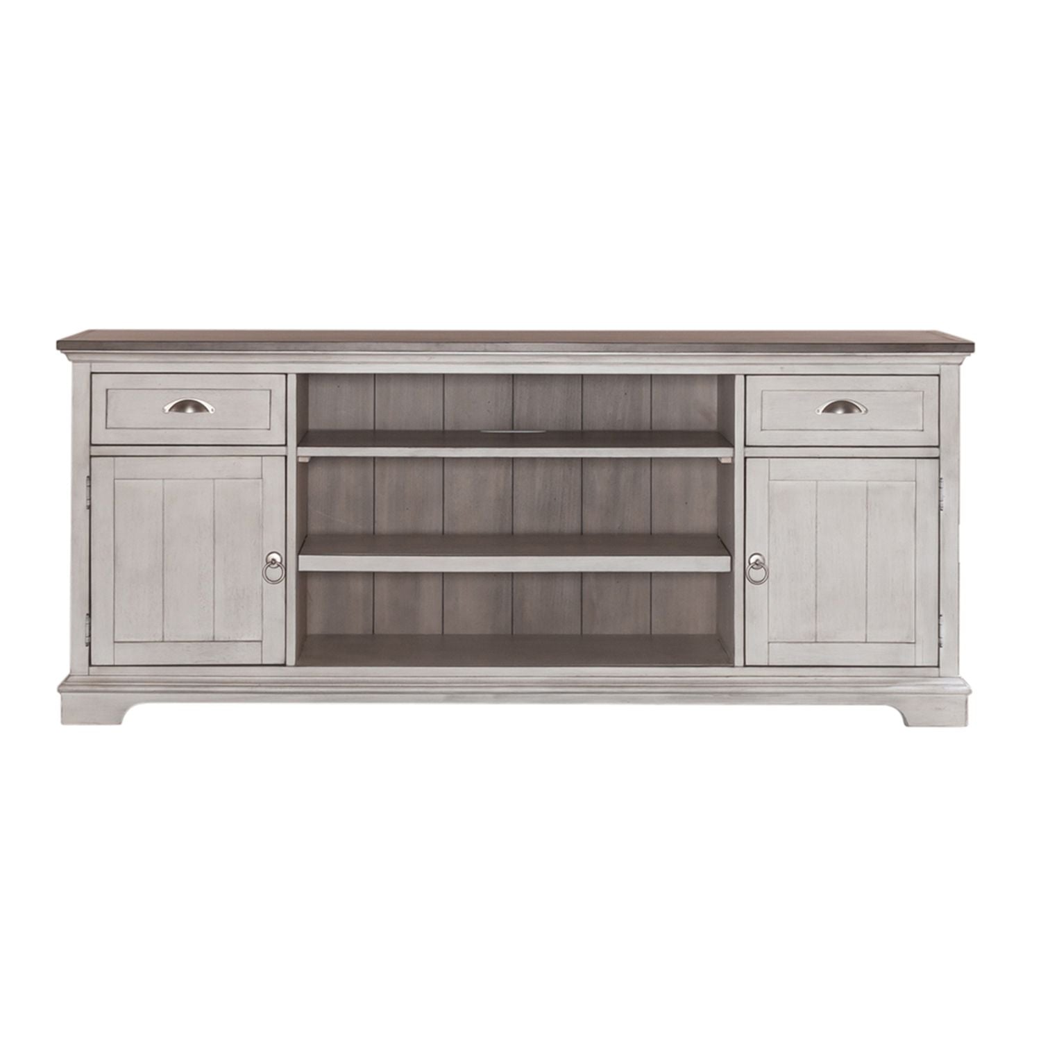 Capture the essence of the tranquility of the sea blended with the charm of a cozy cottage with the Ocean Isle 72" tv stand. Crafted with rubberwood solids and pine veneers, this piece features an antiqued white finish with weathered a weathered pine top, planked back panels, adjustable shelving, fully stained interior drawers, anchored by bracket feet and accented by satin nickel cup and drop ring hardware. This piece can accommodate most 80" TVs. This stand is available in alternate finishes and 3 different sizes, sure to be a great accent for any home.