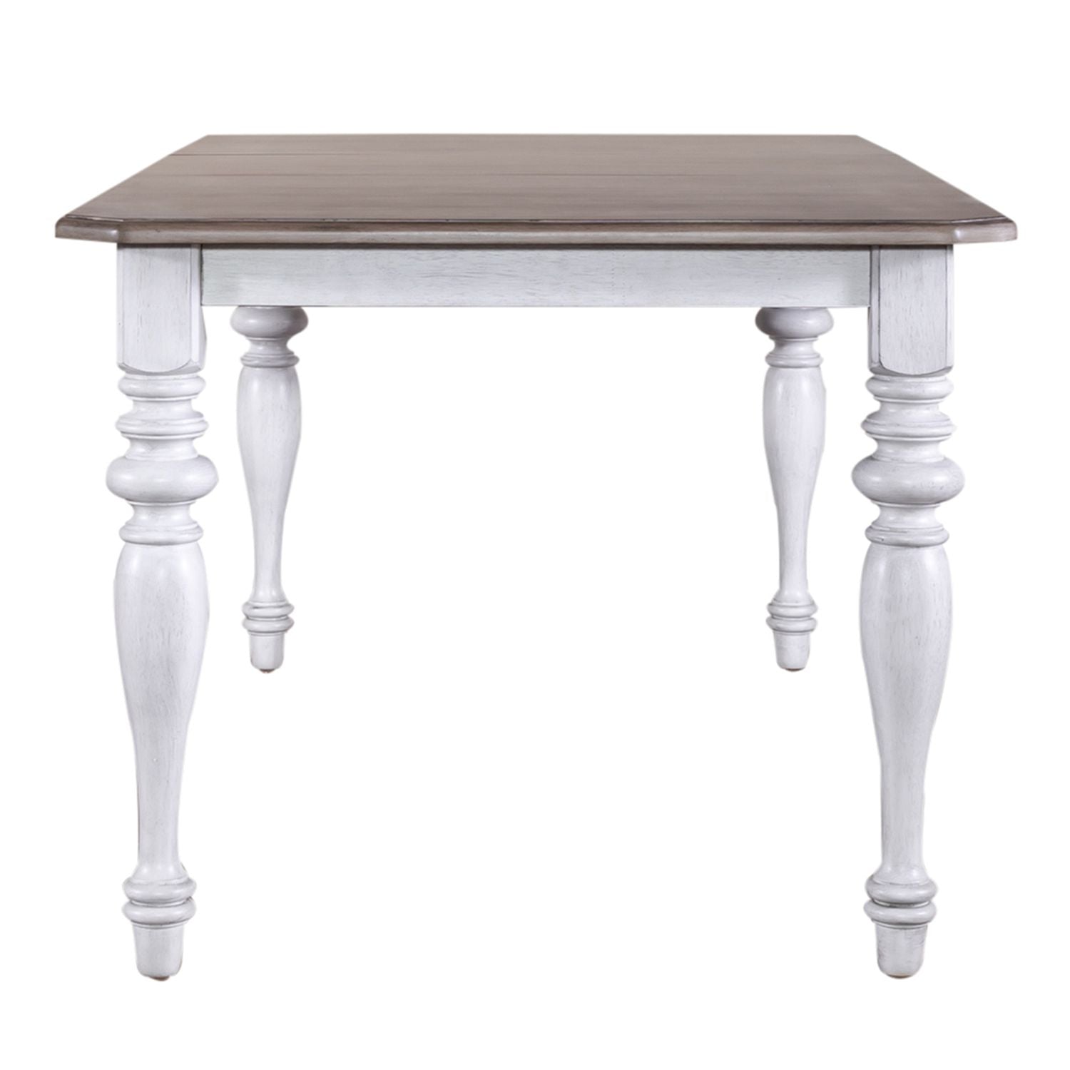Gather around the Ocean Isle rectangular leg table. Crafted of rubberwood solids with pine veneers, this piece features an antique white finish with weathered pine, one 18-inch removable leaf, canted corners, pine veneer top, a two-toned finish and is anchored by heavily turned legs. This piece is available in alternate finishes, sure to be a great addition to any home. Elegantly styled and casually proportioned, this table works in a dining room or kitchen dining combination effortlessly.
