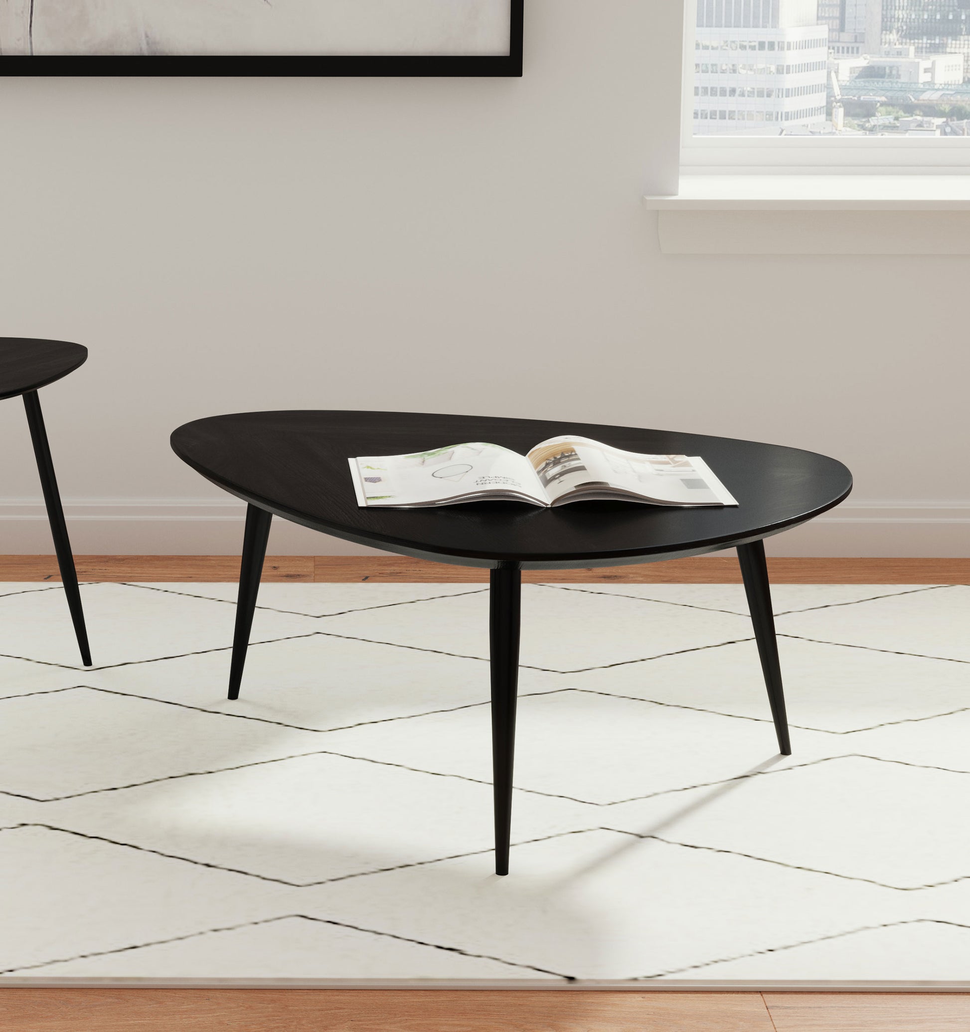 Center your living room seating around the sleek, contemporary design of this triangular coffee table. Handcrafted from solid mango wood, its black finish highlights the smooth texture of the top while enhancing its modern appeal. The triangular shape with softly rounded corners lends a light and airy feel, complemented by tapering splayed iron legs with a black powder-coated finish. Durable and stylish, this handmade cocktail table brings a sense of balance and sophistication to any seating arrangement.