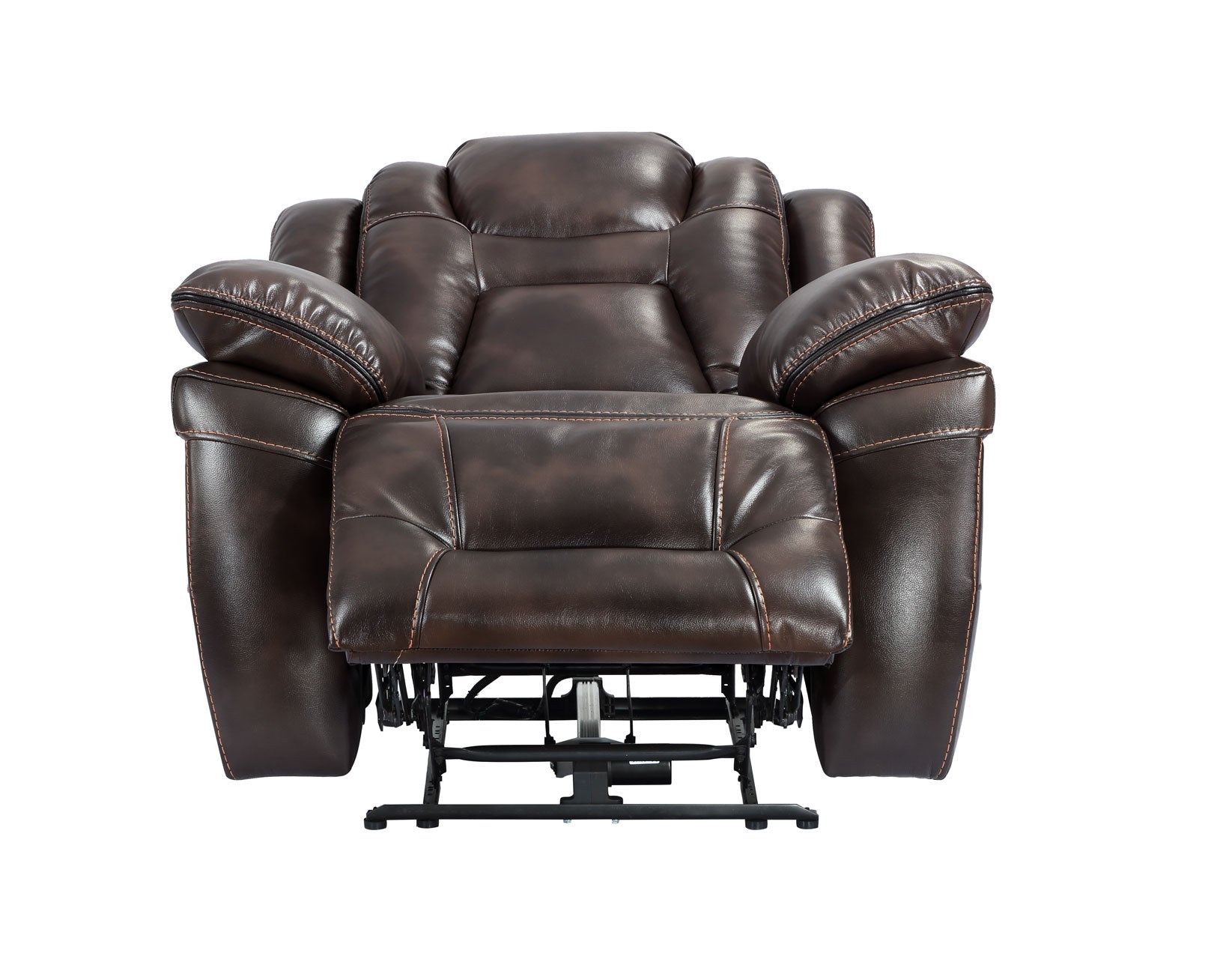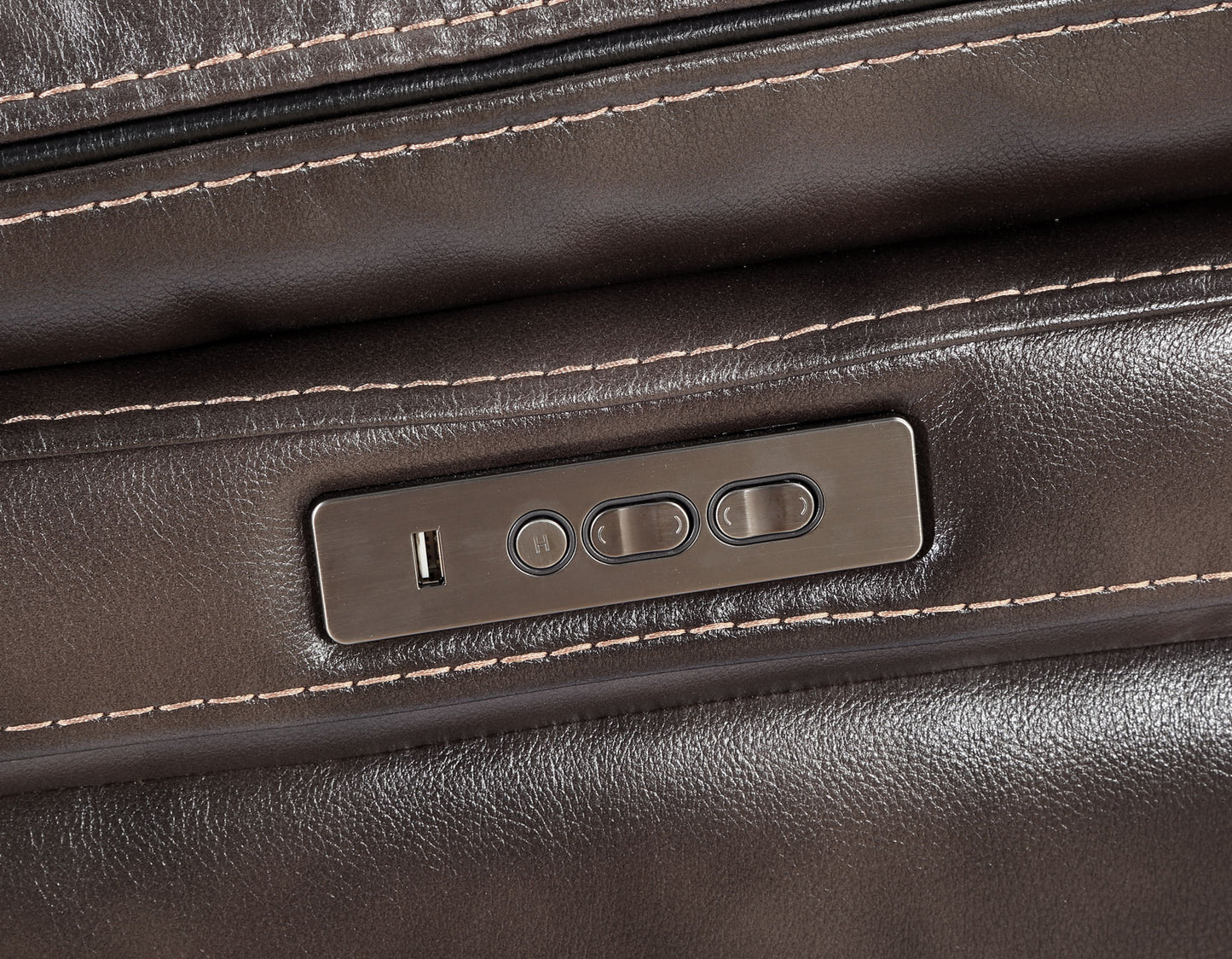 Start your engines with the Dual-Power Oportuna motion group. Elaborate padding and stitching give your seat the look and feel of a race car right in your living room. Draped in beautiful coffee leatherette, this group also has all the bells and whistles you crave with a Dropdown console that serves as the hub of your living room.