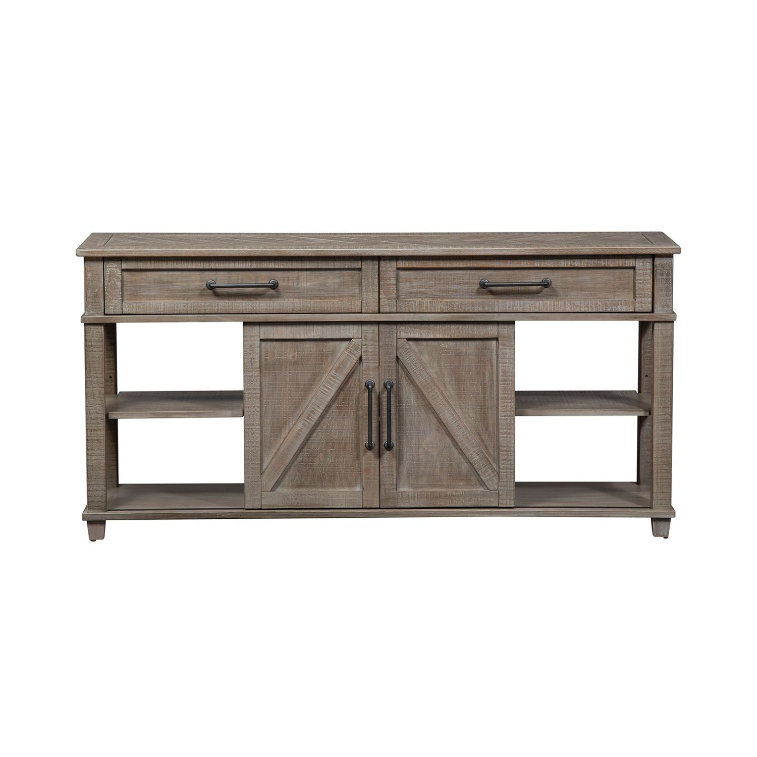 Accent your space with the contemporary Parkland Falls sofa table. Crafted of pine solids and knotty pine veneers, this piece features a weathered taupe finish with saw mark distressing, an appealing planked top, two full extension drawers with wood framed drawer fronts, four open shelves, two sliding doors with an adjustable center shelf for additional storage, wire management provisions, and is accented by pewter bar pull hardware. This piece is a great addition to any rustic, contemporary, or casual living space.