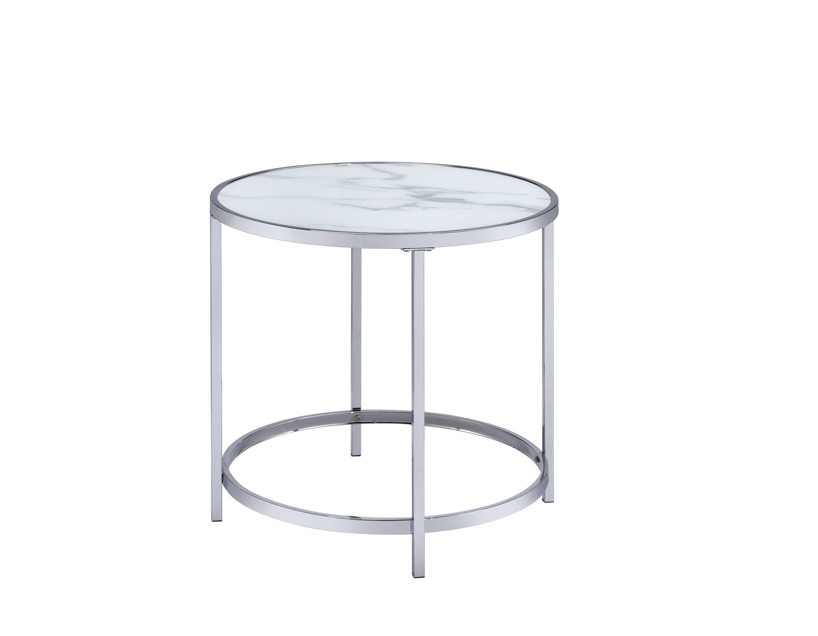 Experience an elegant interplay of flowing shapes with faux marble glass and chrome in the nesting sets of Rayne occasional tables. The nesting cocktail table adds an interesting multi-level dimension to any living room area that you will wonder how you lived without. The nesting cocktail table gives you more storage or display area as well as something interesting to behold.