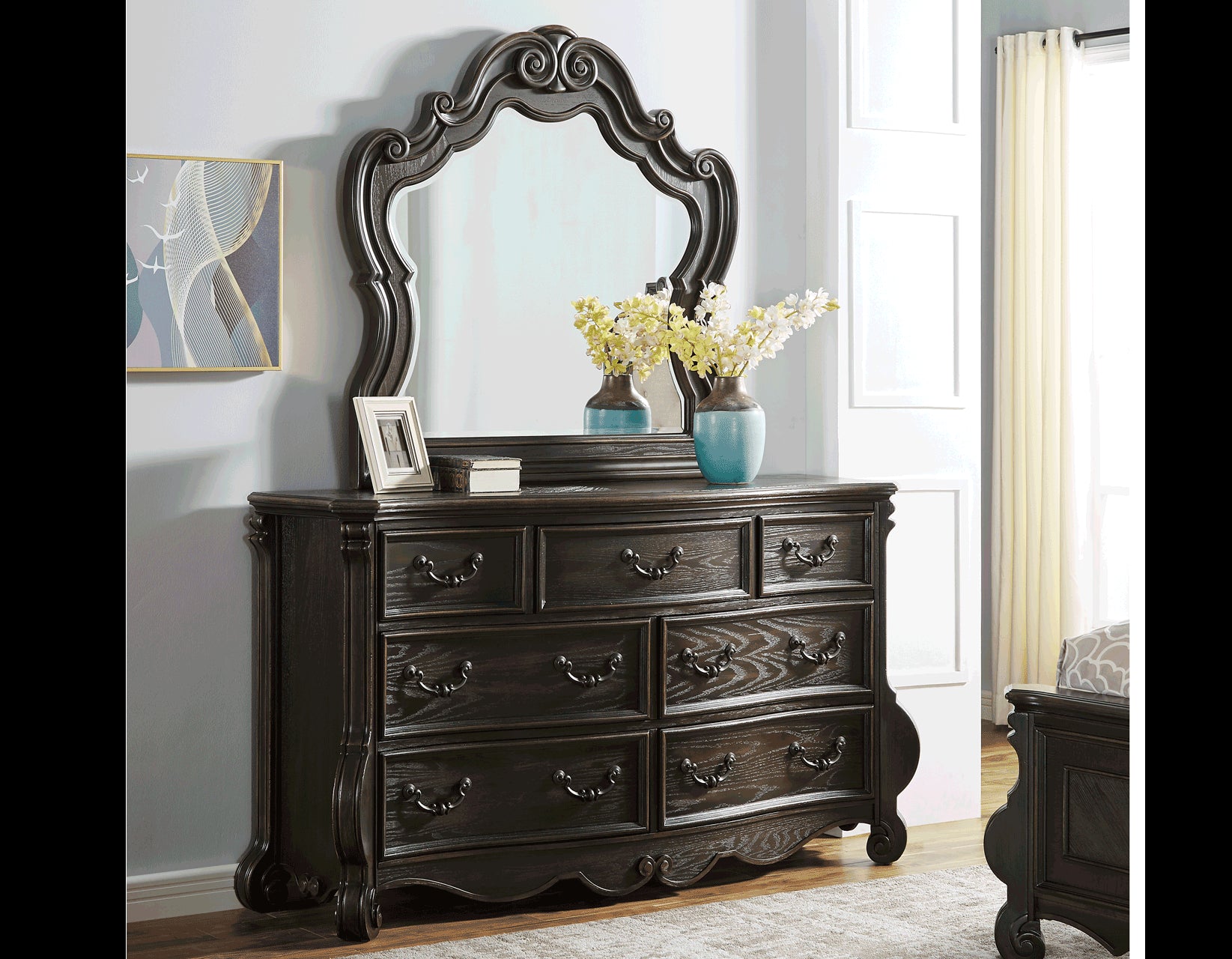 Opulent traditional styling in a Dresser with room for storage. With details that will dress up your bedroom, Rhapsody features a beautiful shaped front with fluted pilasters and scrolled legs in a multi-step molasses finish with antiqued finish rub-through that are reminiscent of fine antiques. Use alone or pair with the Rhapsody Mirror.