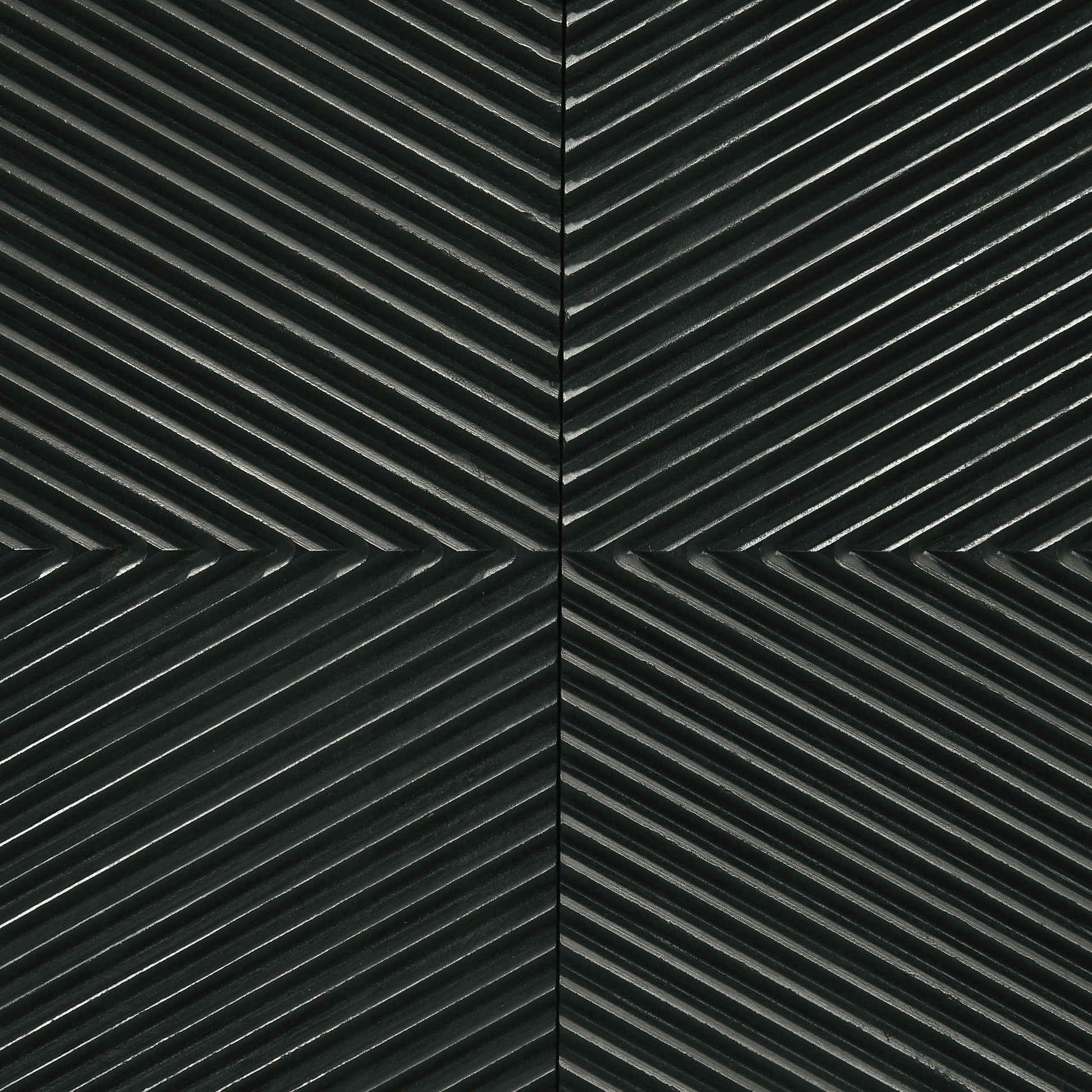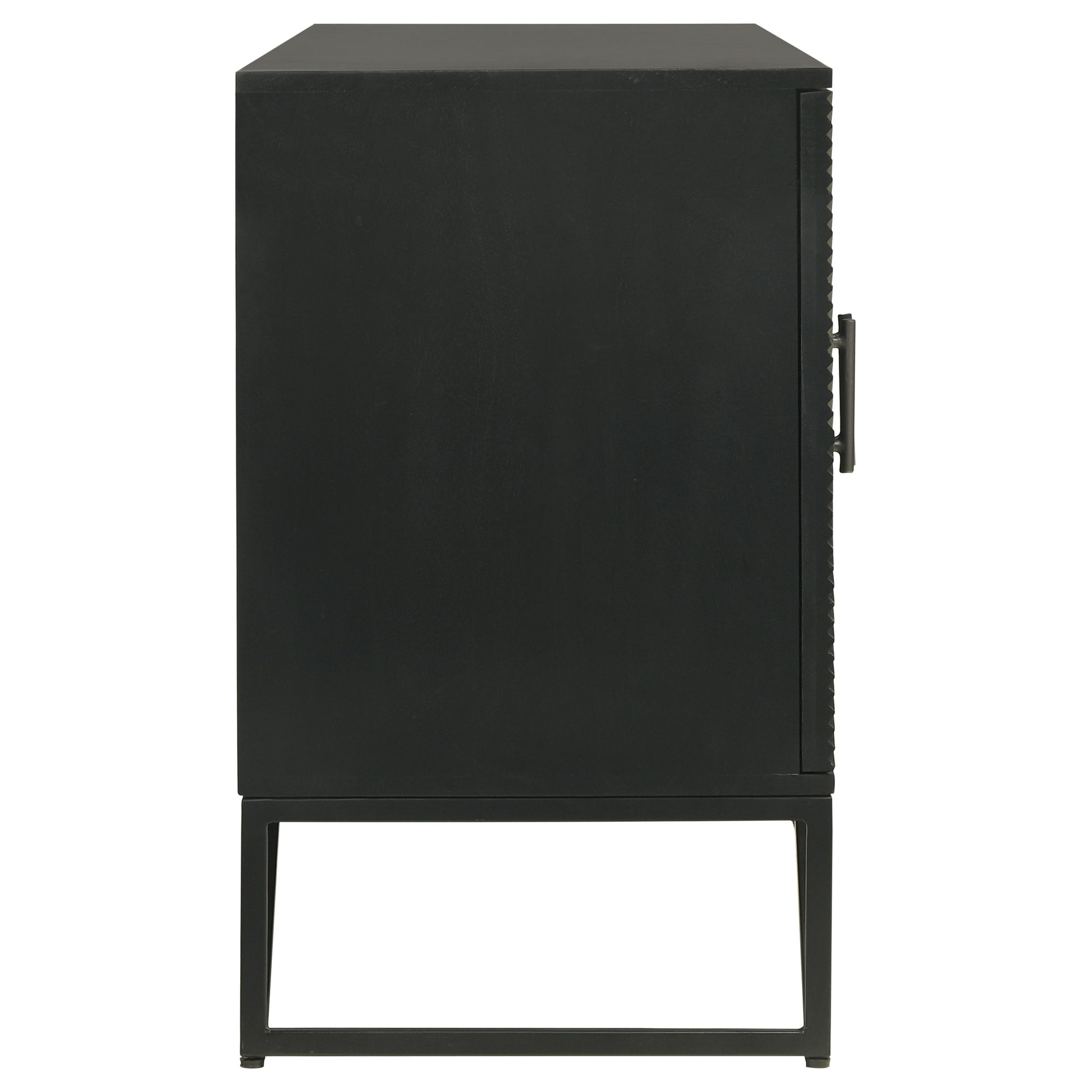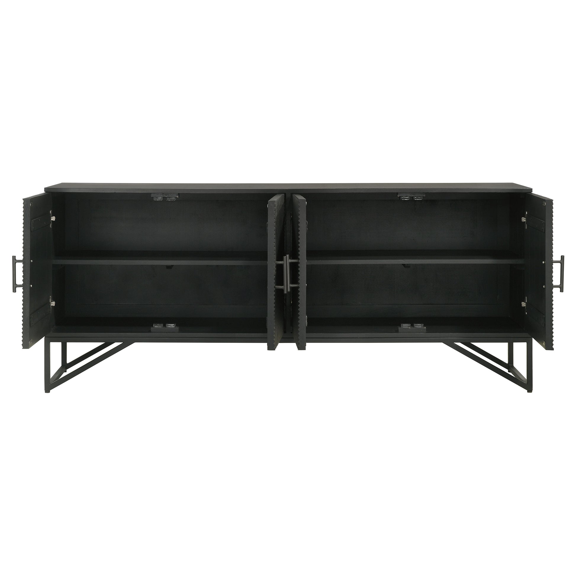 Bold finish composite wood and iron merge to create a stylish and durable four-door accent cabinet. Perfect for use in your dining room, living room, or media room, this chic cabinet is versatile and attractive. Diagonal self-striping adds textured effects on its door fronts to create a compelling look. Find space on two adjustable shelves behind four doors that open with matching black iron vertical pulls. Set atop a geometric black finish iron frame, this cabinet serves as a striking example of bold style.