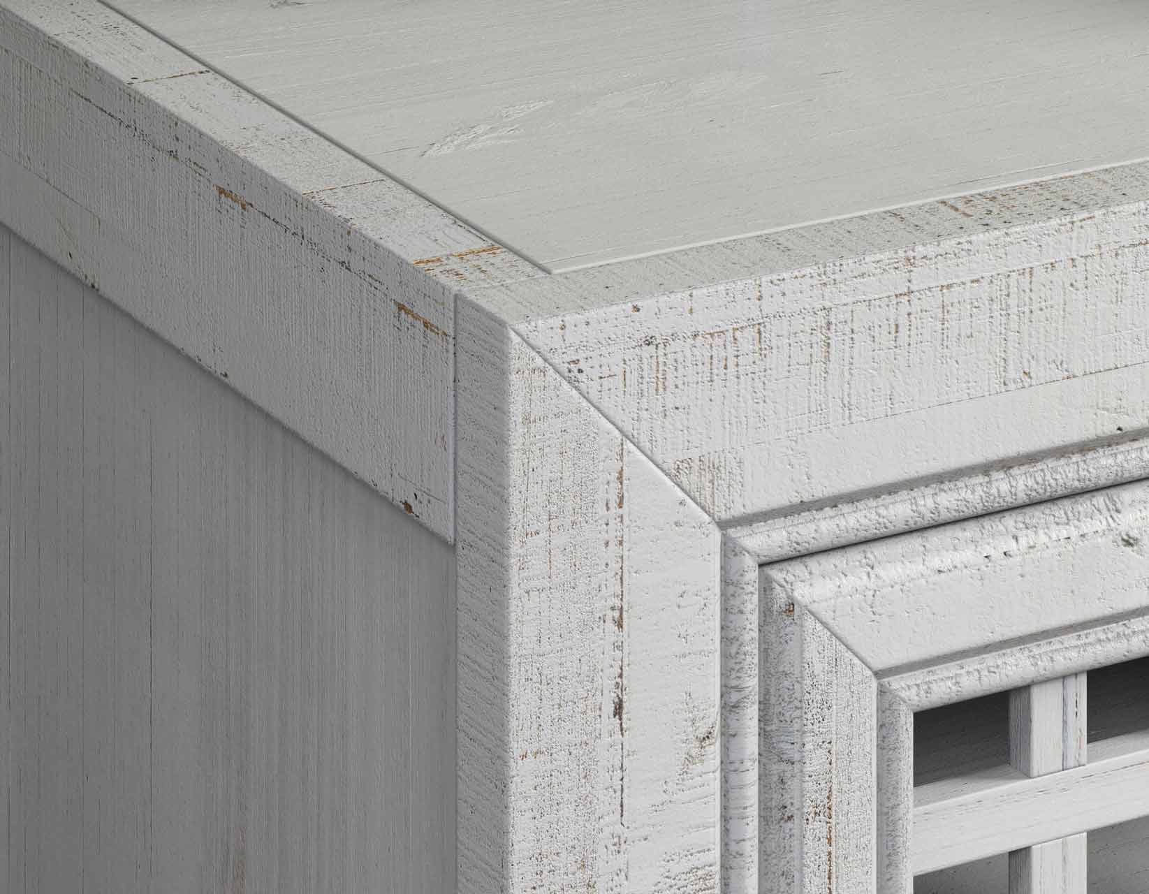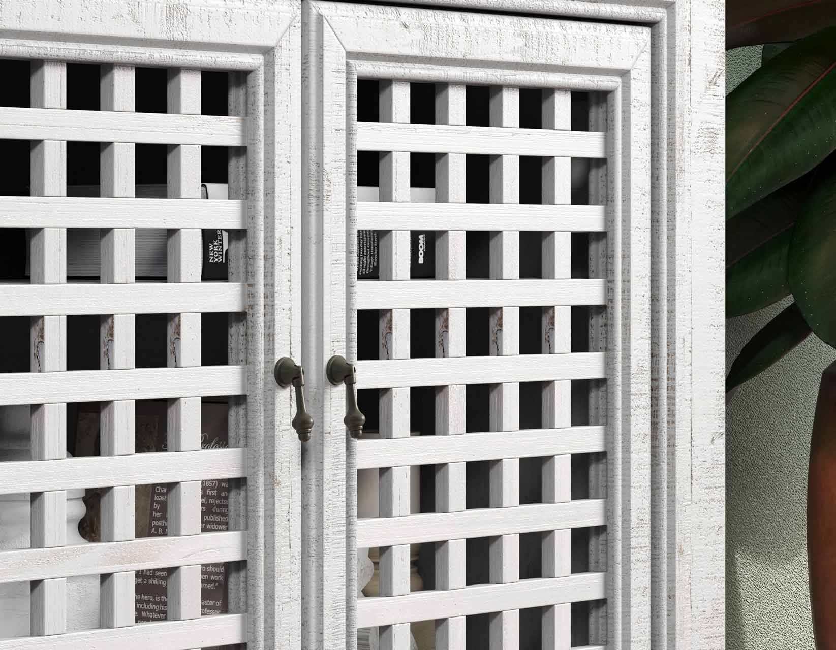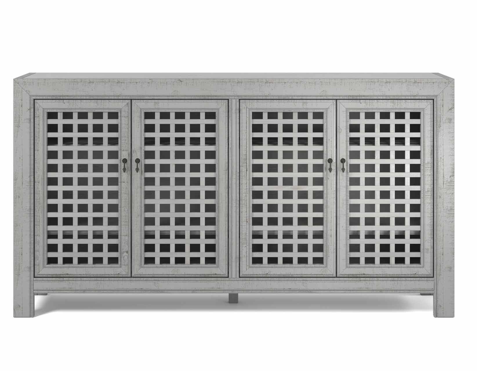An Accent Cabinet with an heirloom feel and antique pie-safe design, the Rio 4-Door Cabinet is built for today’s home accents and electronics. The 70-inch long cabinet has four adjustable shelves and lattice door fronts for semi-open display or for electronic remote use. A beautiful powder gray finish warms the room while the four adjustable shelves ensure you configure the piece exactly to your own specifications.