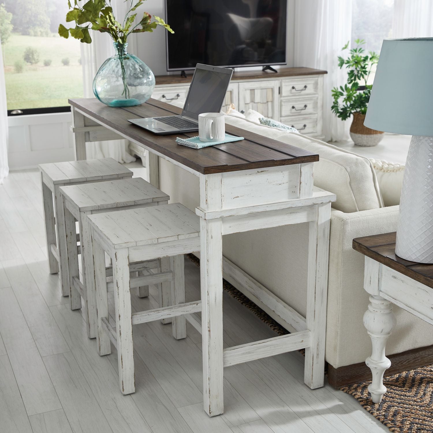 Create a calm and peaceful oasis with the River Place four piece set. Crafted with Pine solids and veneers, this set features a heavily distressed two-tone Riverstone White and Tobacco finish and includes the console bar table and three console stools. The console bar table has a built-in charging station complete with two electrical outlets, one USB port, and one USB-C fast charging port for all your electronic needs. The top features a high-low veneer pattern for textural interest. The stools have a planked seat and combined with the square block legs with nylon chair glides to protect your flooring, creates an airy and inviting atmosphere. Perfect to place behind the sofa for additional seating, the River Place four piece set strikes the perfect balance of life on the coast and a comfy home tucked away in the hills.
