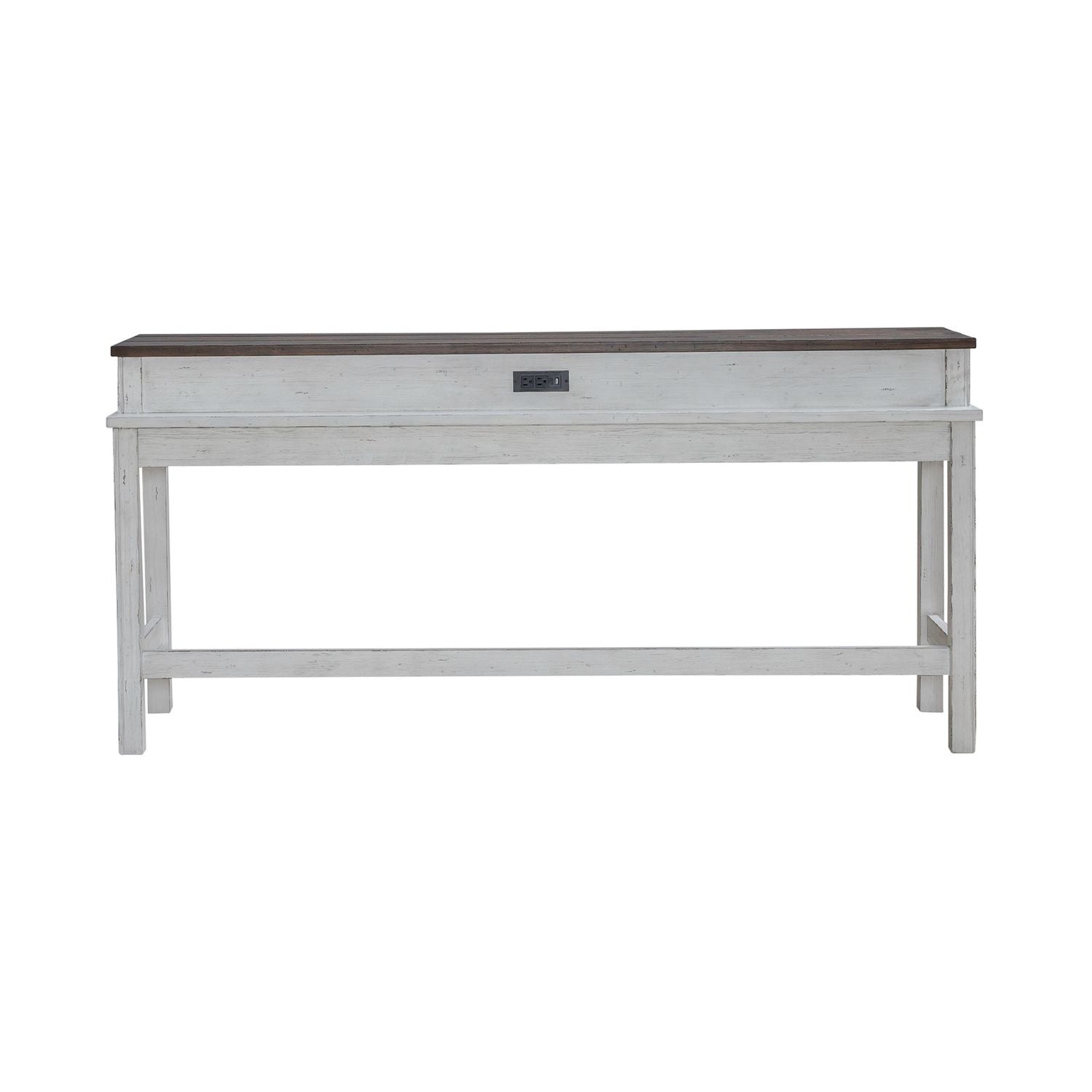 Create a calm and peaceful oasis with the River Place console bar table. Crafted with Pine solids and veneers, this piece features a heavily distressed two-tone Riverstone White and Tobacco finish. This console bar table has a built-in charging station complete with two electrical outlets, one USB port, and one USB-C fast charging port for all your electronic needs. The top features a high-low veneer pattern for textural interest. Perfect to place behind the sofa for additional seating, the River Place console bar table strikes the perfect balance of life on the coast and a comfy home tucked away in the hills.