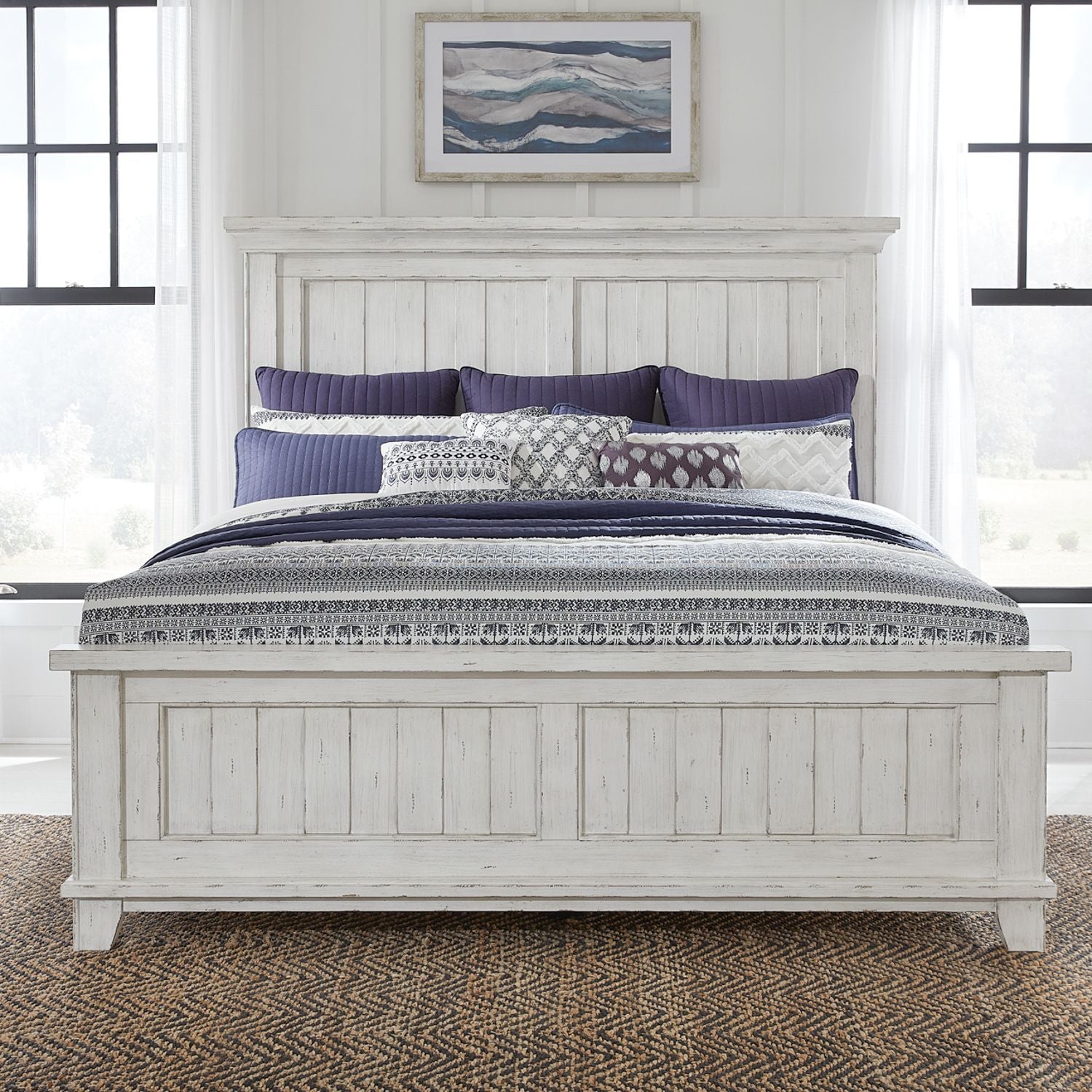 Create a room of your own that provides the perfect start and end to every day with the River Place king panel bed. Crafted with excellence using Pine solids and veneers, this bed features a heavily distressed Riverstone White finish. Heavy crown molding accents the top of the mansion headboard. A block style cap rail accents the top of the footboard. High-low veneer panels are featured on both the headboard and footboard. Wide pilasters flow into angled block feet to complete the farmhouse styling with a timeworn feel that we all know and love. Use the poster/mansion bed rails, which feature bolt-on support and a center support slat system to complete the bed. The River Place king panel bed creates an inviting, airy atmosphere in your home while providing comfort in your own private getaway.