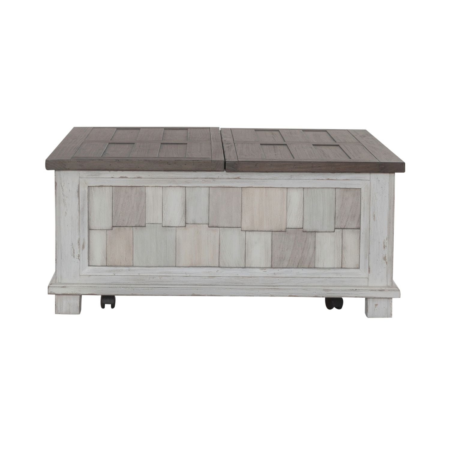 Create a calm and peaceful oasis with the River Place lift-top storage cocktail table. Crafted with Pine solids and veneers, this piece features a heavily distressed two-tone Riverstone White and Tobacco finish. Attention is immediately drawn to the side panels with a unique shingle design with color tones of white, gray, and brown that blend effortlessly with the Riverstone White and Tobacco finishes. The top features a high-low veneer pattern for textural interest. One side of the top offers a lift-top design allowing you to enjoy a snack while watching TV from the comfort of your couch while the other half of the top features a flip-top with tons of deep storage. Wide pilasters flow to the block foot base and casters for easy mobility. The River Place lift-top storage cocktail table strikes the perfect balance of life on the coast and a comfy home tucked away in the hills.