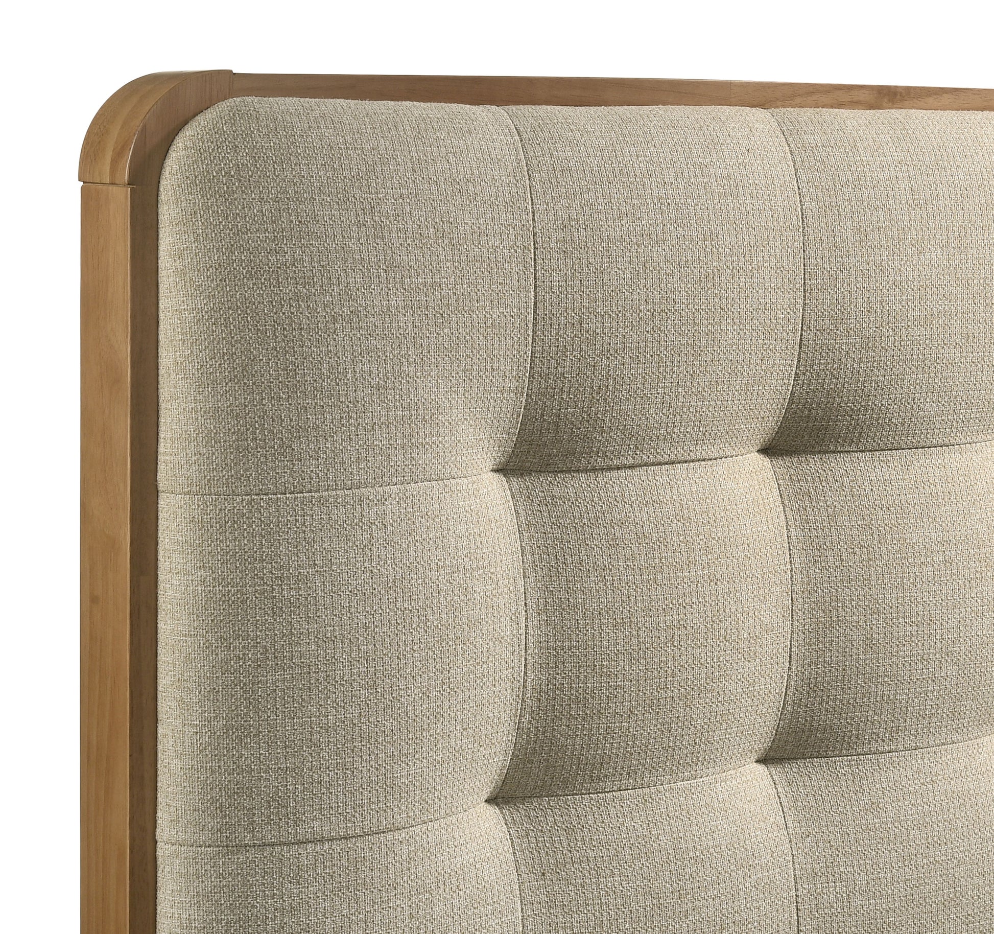 • Cool beige fabric upholstered headboard with thick padding and square tufting