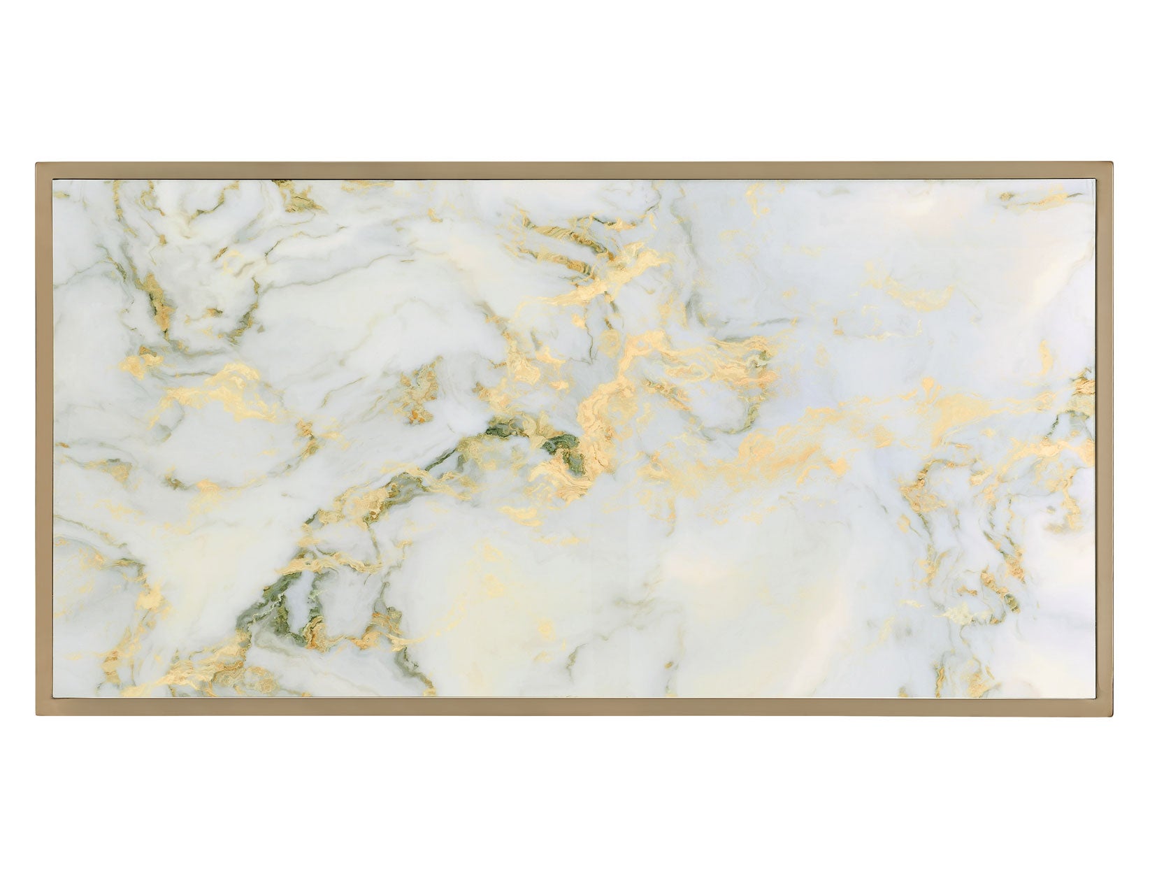 The Salvador Coffee Table is a beautiful centerpiece that brings a modern touch to your living space. With a white faux-marble top and a bronze chrome metal base, it combines elegance and sturdy support courtesy of the sleek sled base. The mixed materials create a unique look, with the bronze base highlighting the yellow veins in the marble top. Perfect for adding a bit of luxury to your living room, this coffee table is sure to be a favorite.