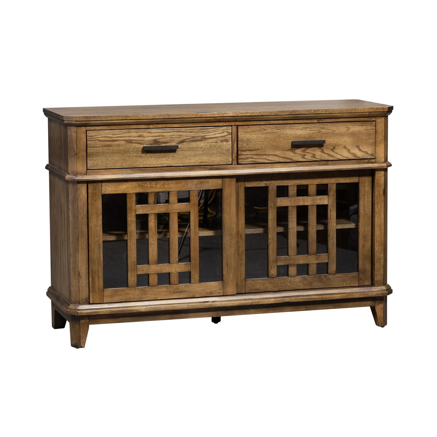 Accent your dining room with the Santa Rosa II server. Crafted of rubberwood solids and oak veneers, this piece features two felt lined full extension drawers allowing for easy access to storage and a silverware tray, two wood framed sliding glass doors with a decorative grid overlay, and is accented by antique brass bar pull hardware. This piece also features canted corners, tapered feet, and one adjustable shelf behind each sliding door. Finished in an antique honey with a mission design, this server translates well into any decor.