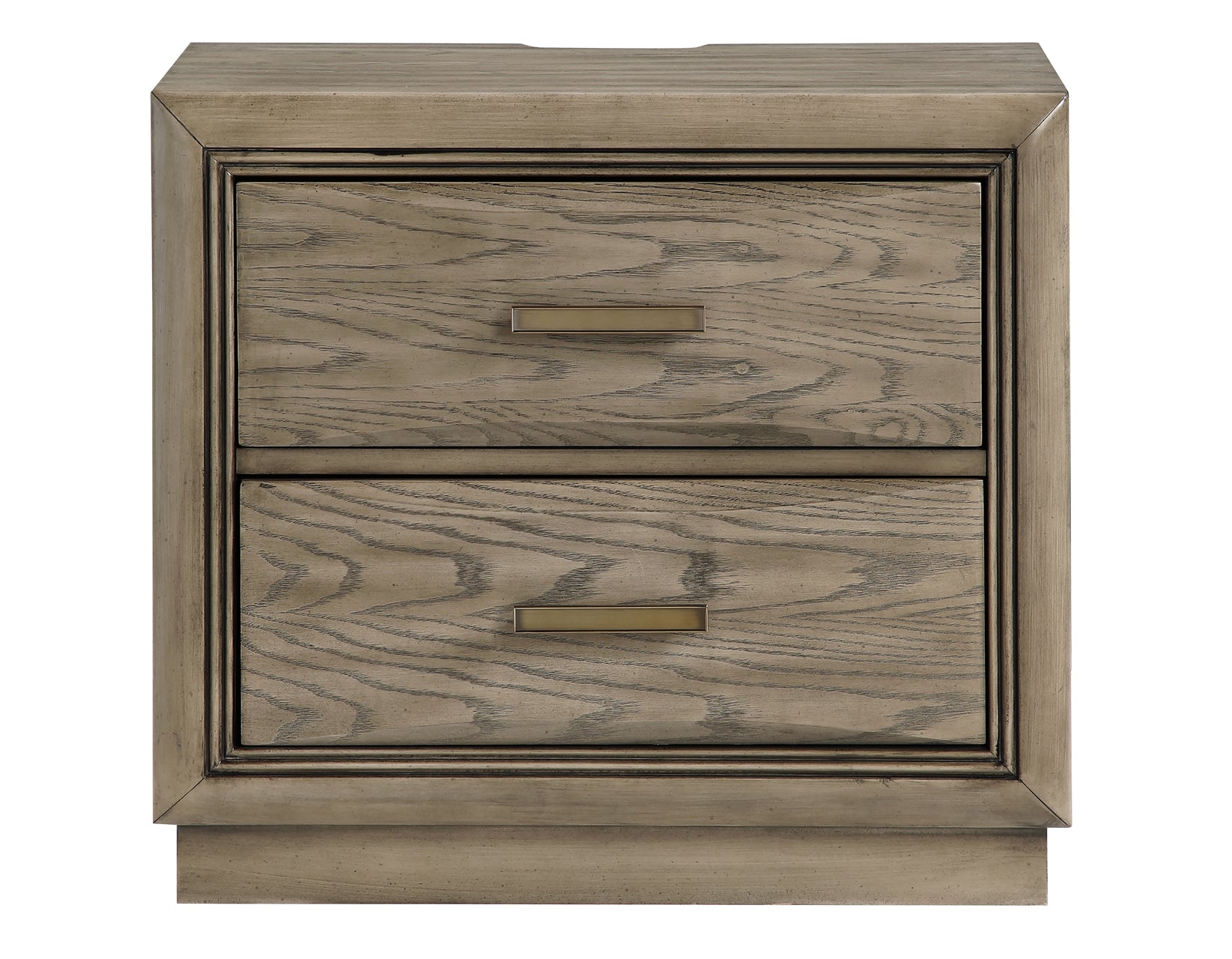 A convenient bedroom companion, the Sonoma 2-Drawer Nightstand organizes your essentials with style and grace. Its gray-washed finish and modern transitional design seamlessly complement any decor. Expertly crafted from oak veneers and Asian hardwoods, this piece features double-reeded framed drawers and a plinth base, adding refined elegance. Built-in USB and electric outlets keep devices charged and accessible, while the 2-drawer design provides ample storage. Burnished champagne hardware adds a luxurious touch to this functional and stylish nightstand.