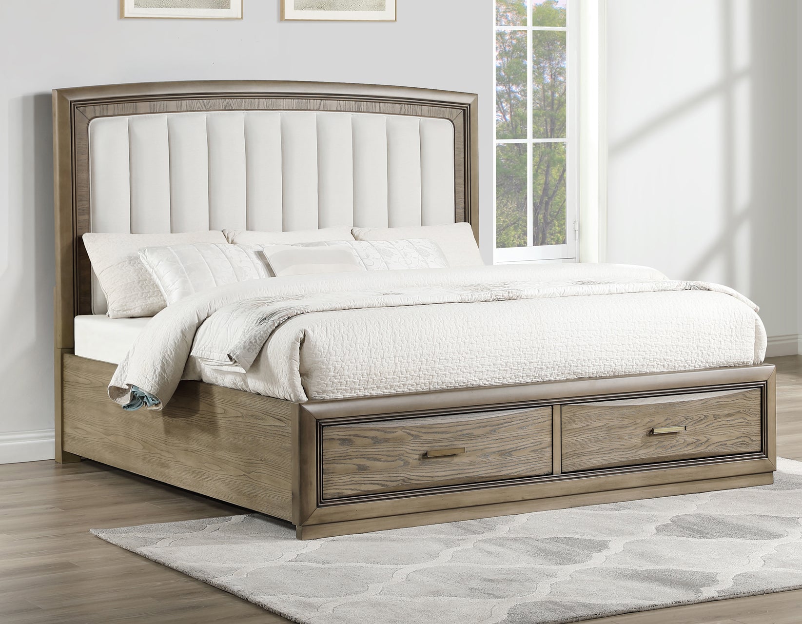 Designed with modern living in mind, the Sonoma Queen Storage Bed offers the perfect marriage of style and practicality. Two spacious built-in drawers at the foot of the bed provides the ideal solution for storing bulky seasonal items or everyday essentials. The gently arched headboard is adorned with a cream fabric insert, adding a soft, inviting touch that beautifully complements the cocoa gray finished oak veneers. The result is a clean, contemporary look that transforms your bedroom into a serene and organized sanctuary. The Sonoma Queen Storage Bed is not just a statement piece—it’s a smart, stylish investment for your home.