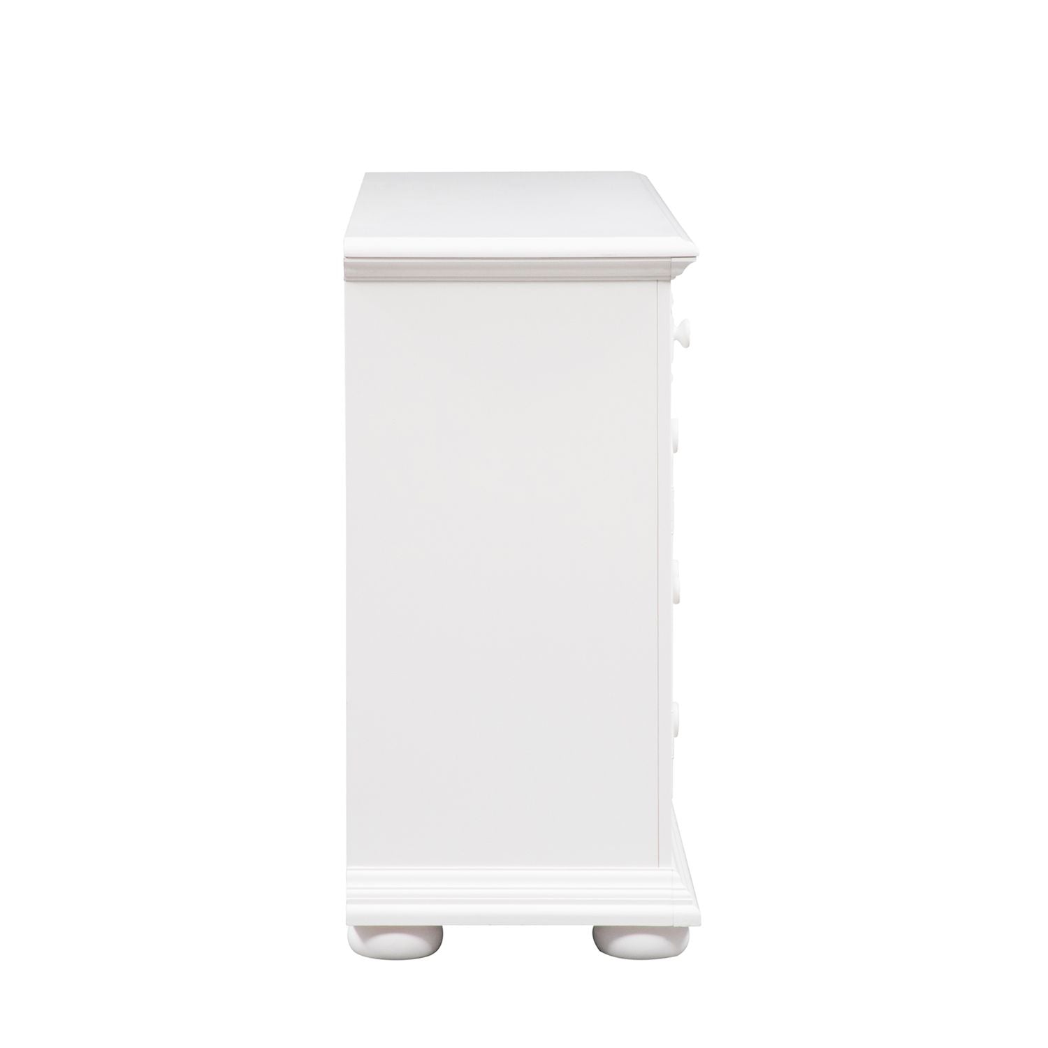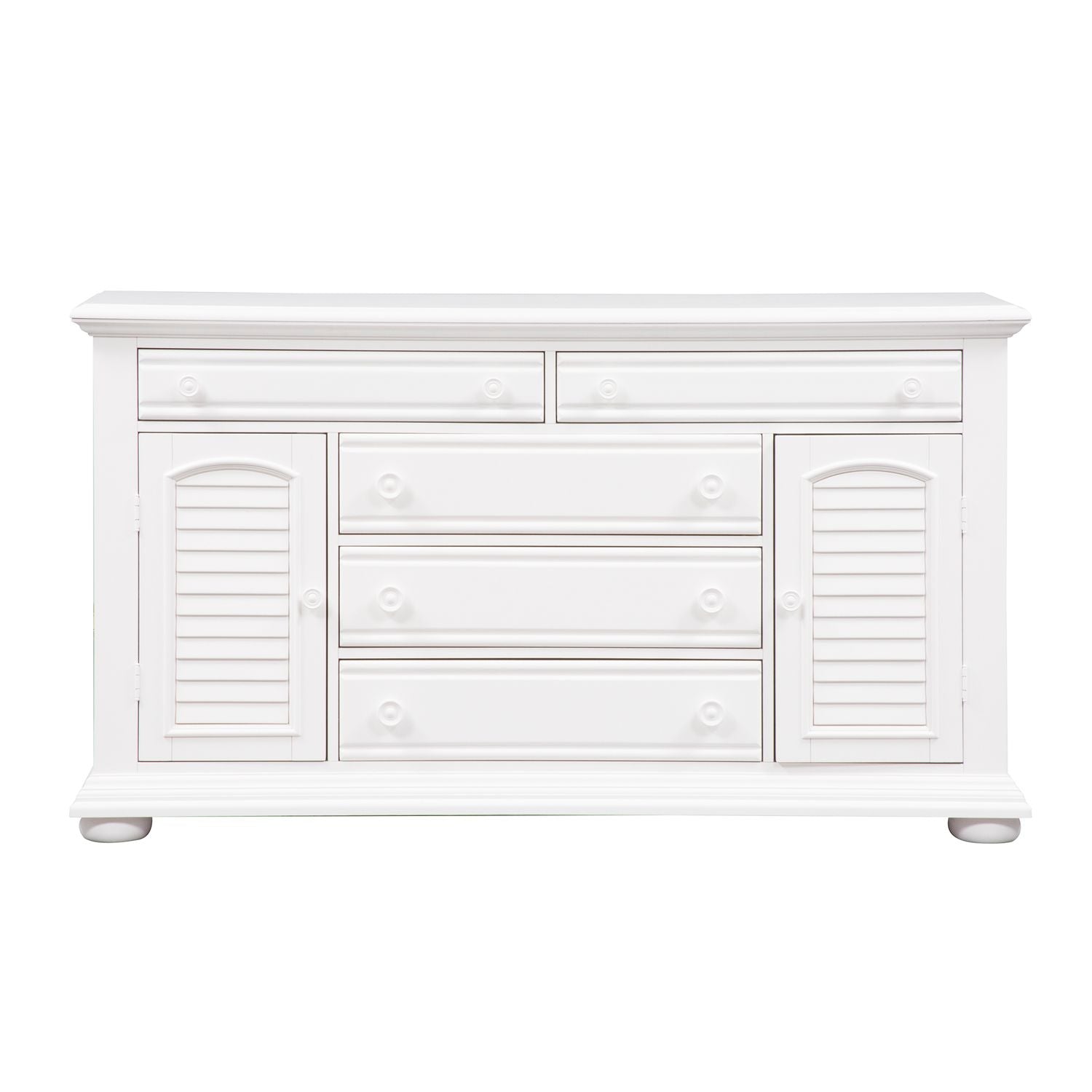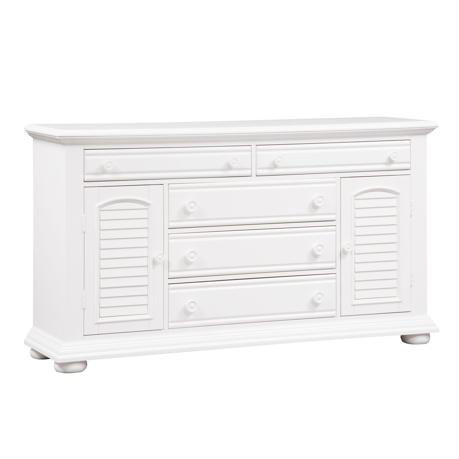 Obtain a fashionable cottage look with this 2 door 5 drawer dresser. The oyster white finish is accented by louvered panels and wooden knob hardware. Storage abounds with the 3 large fully stained drawers, 2 smaller flip down top drawers, and the adjustable shelf located behind each louvered door.