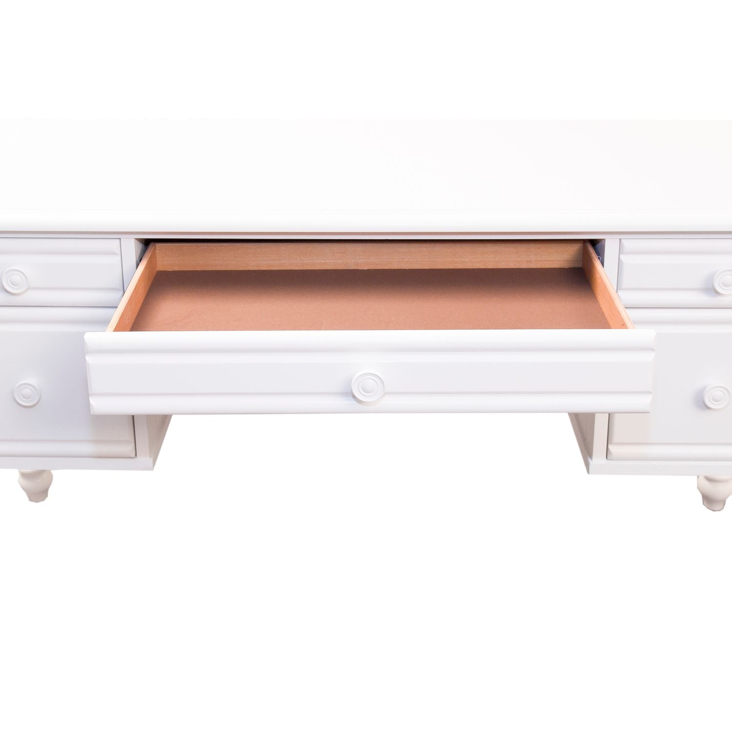 Live life beautifully with the Summer House I vanity desk, mirror, and stool. Crafted of poplar and pine solids this kit features an oyster white finish, bead molding, full extension drawers with felt lined top drawers, turned legs, and is accented with wooden knob hardware. The vanity desk features five drawers for storage and pairs well with the trifold mirror with a beveled edge. Sit in comfort with the vanity stool that has a linen upholstered seat and nylon chair glides to protect your flooring. With cottage design always in fashion, make the Summer House I a staple in your home.