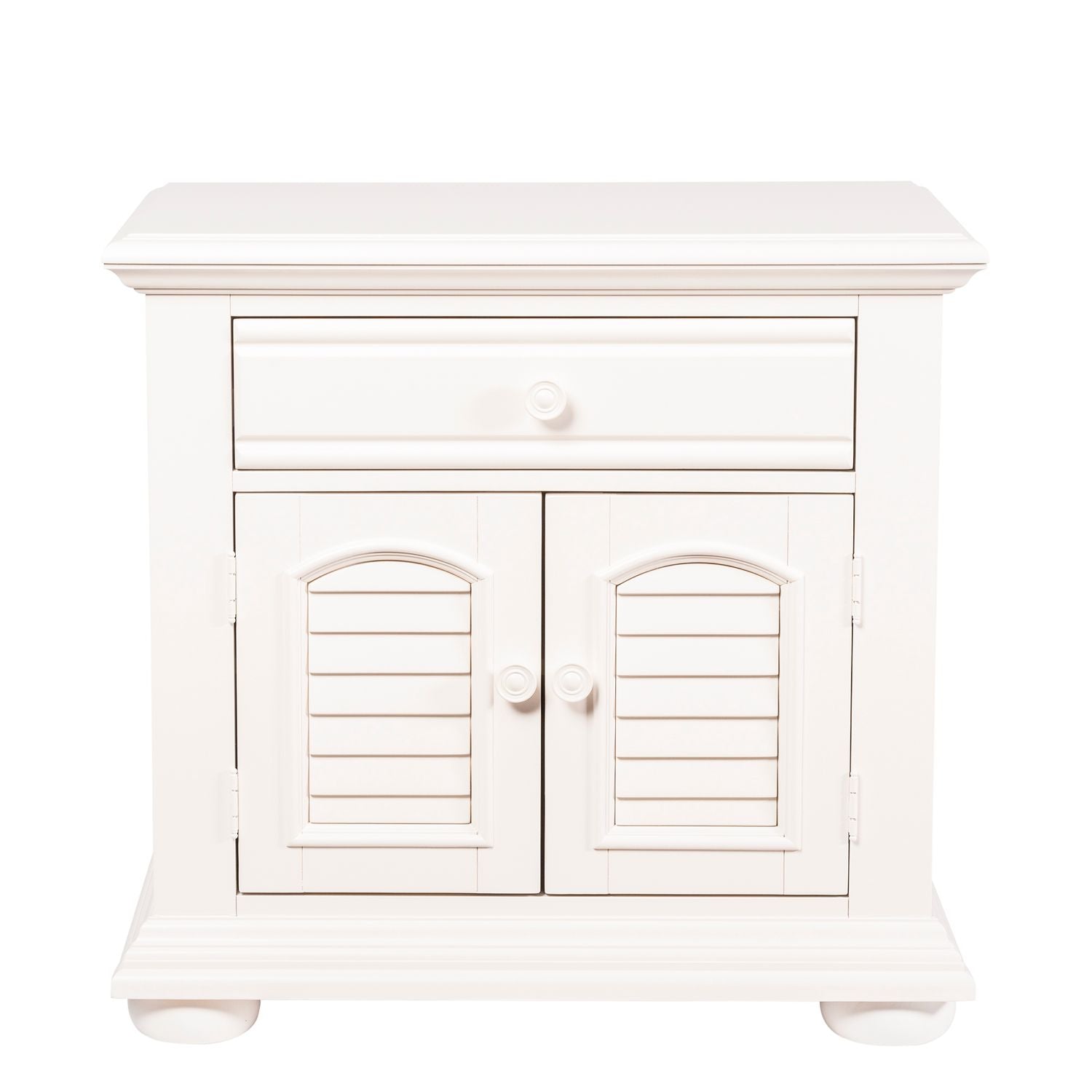 Live life beautifully with the Summer House I king panel bed, dresser, mirror, and nightstand. Crafted of poplar and pine solids this kit features an oyster white finish, bead molding, bun feet, full extension drawers with felt lined top drawers, and is accented with wooden knob hardware. The panel bed features louvered panels and arched crown molding. The dresser has two louvered panel doors and five drawers including two smaller flip down top drawers. Attach the arched louvered panel mirror with a beveled edge with the included bolt-on supports. Place the unique one drawer, two door nightstand next to your bed and enjoy the abundance of storage with the felt lined top drawer and the adjustable shelf behind the louvered panel doors. With cottage design always in fashion, make the Summer House I a staple in your home.
