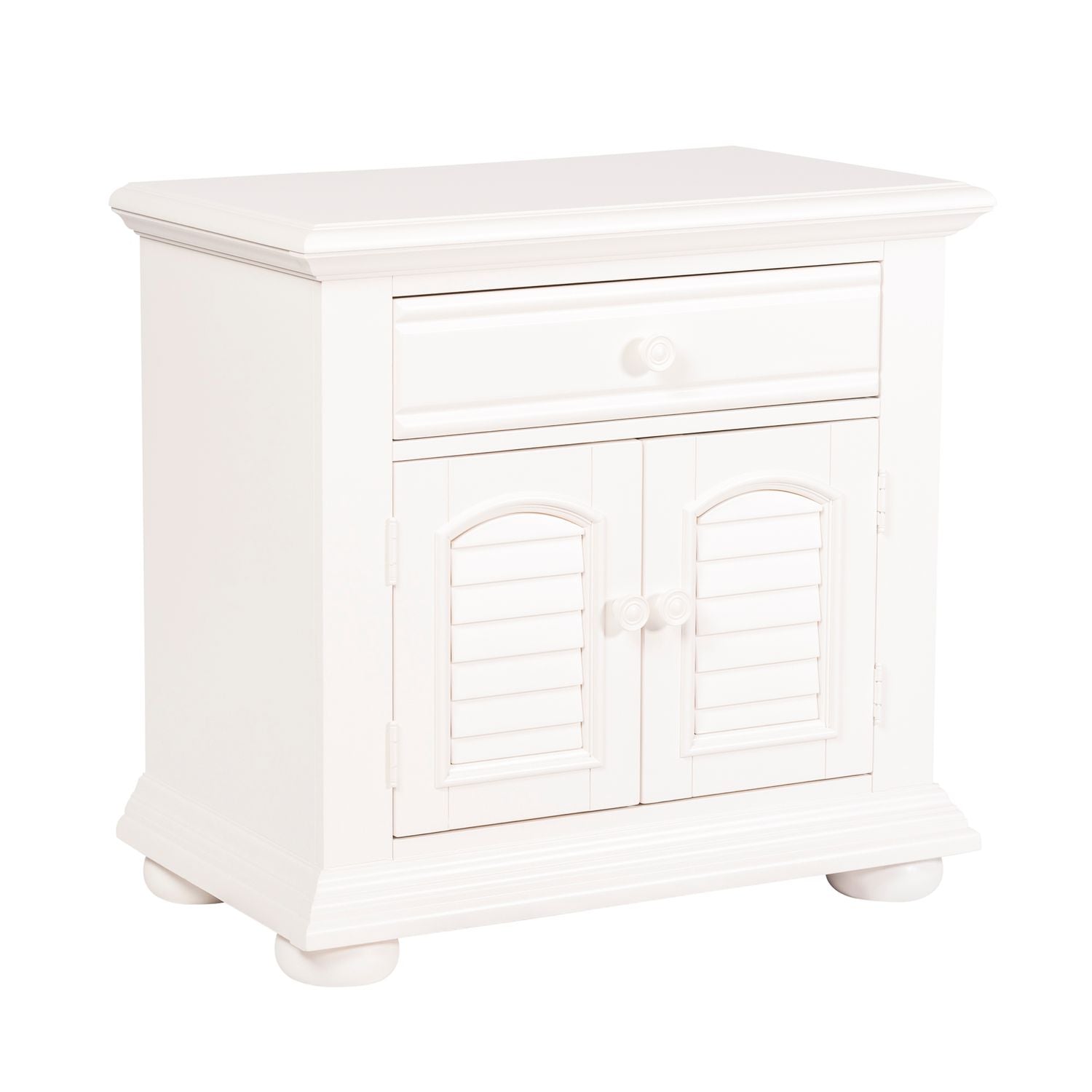 Obtain a fashionable cottage look with this 1 drawer, 2 door night stand. The oyster white finish is accented by louvered panels and wooden knob hardware. Storage abounds with the felt lined top drawer and adjustable shelf behind the two doors.