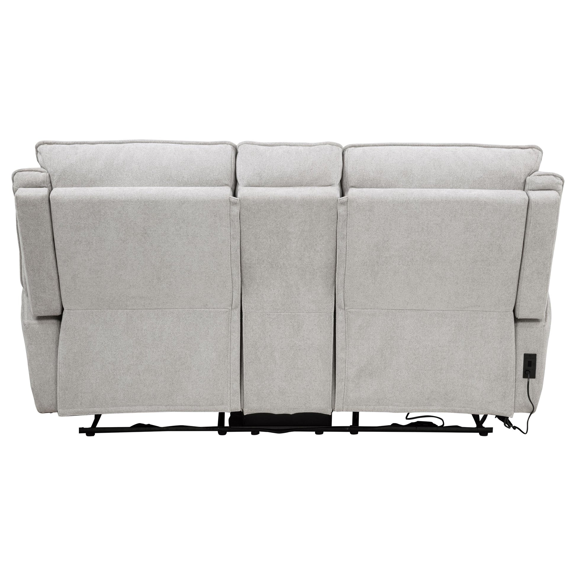 This reclining loveseat captures the essence of cozy sophistication, designed for shared moments and quiet indulgence. Outfitted in plush dove grey chenille, its smooth, sculpted form invites relaxation at the push of a button. Dual power recliners extend effortlessly, controlled by integrated side buttons, while a center console with hidden storage and cup holders adds functional ease. Built atop a sturdy wood and metal frame, it offers enduring comfort for two.
