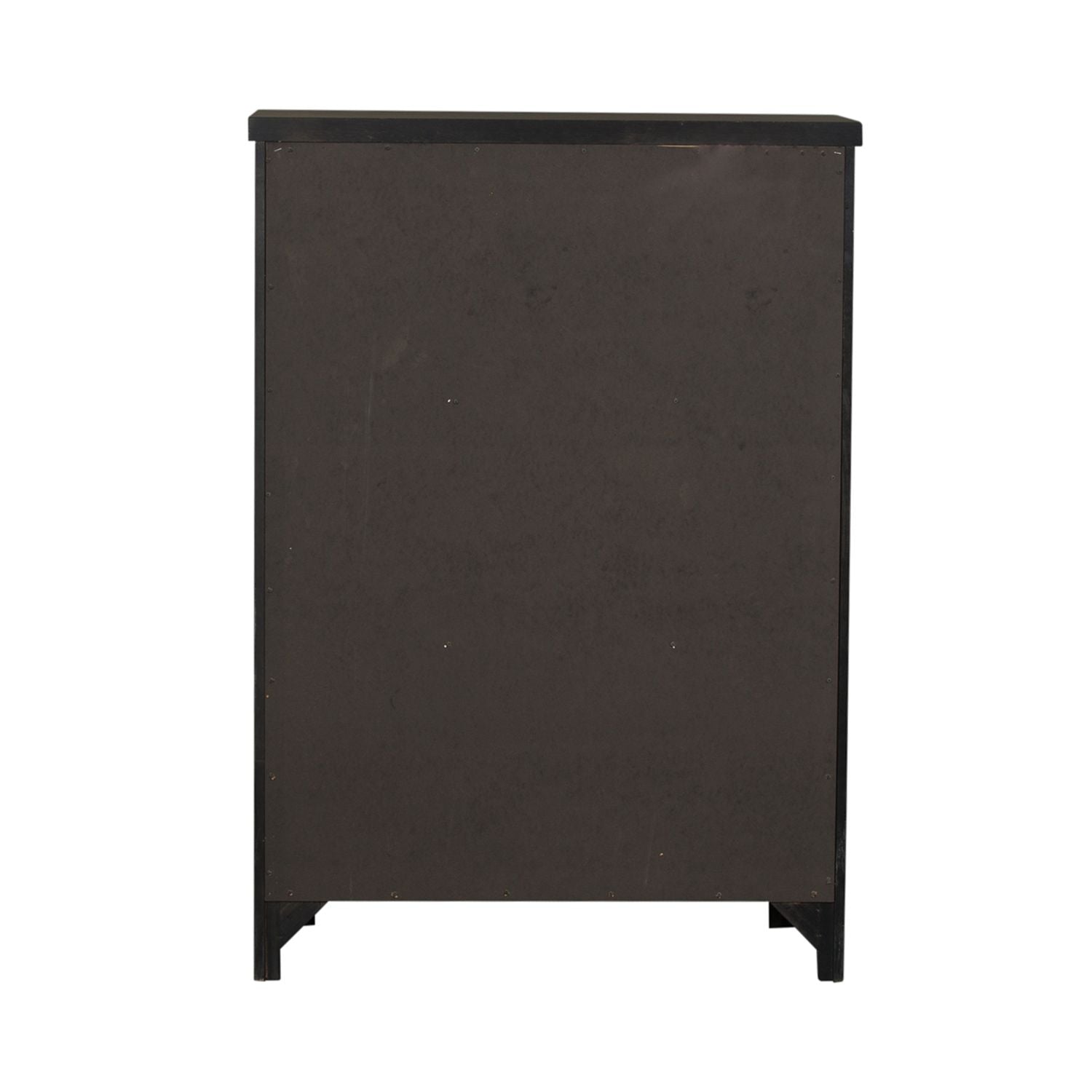 Indulge in a casual, yet contemporary look with this Thornwood Hills chest. Crafted with rubber wood solids and interesting mango veneers, this piece features 5 drawers, fully stained interior drawers, a felt lined top drawer, and bottom case dust proofing. This chest is sure to stand out in any room with its hammered metal strip accents, dark antiqued pewter bar hardware and the unique rock beaten gray finish with detailed saw cuts.