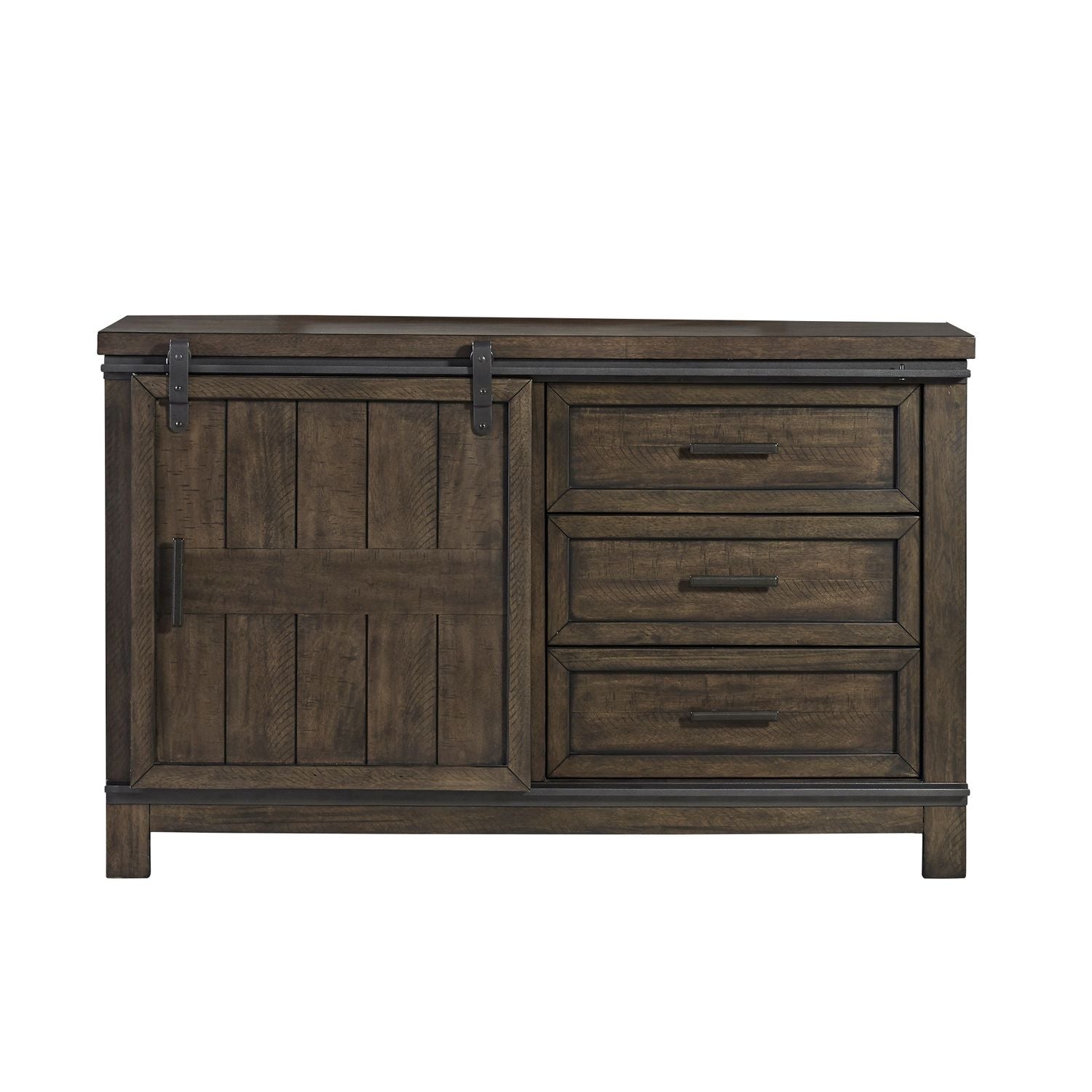 Add a natural feeling to your living space using the Thornwood Hills barn door dresser. Crafted by rubberwood solids and mango veneers, this piece features a rock beaten gray finish with saw cuts, planked tops and sides, sliding planked door with two adjustable shelves behind the doors, three drawers with framed drawer fronts, fully stained interior drawers, wide pilasters with block feet, felt lined top drawer, full extension metal drawer glides for easy access to storage, and heavy distressing.
