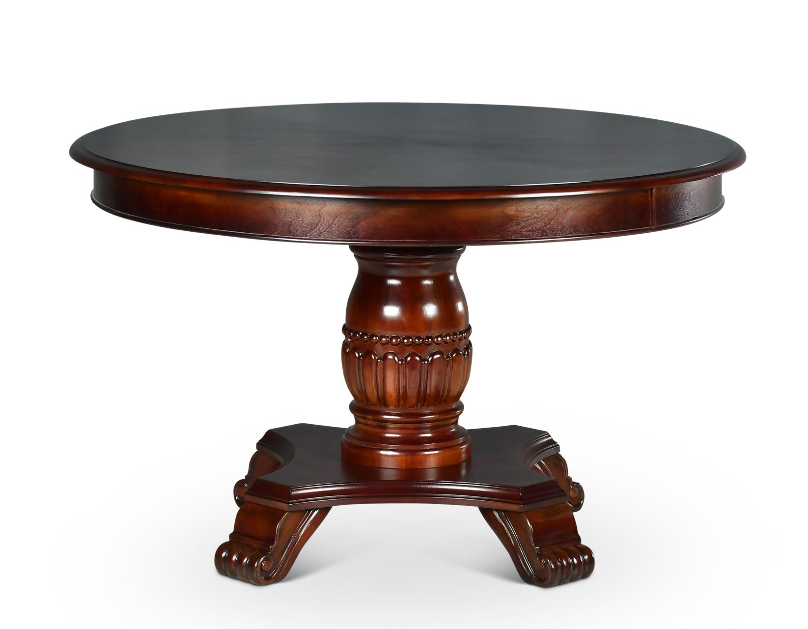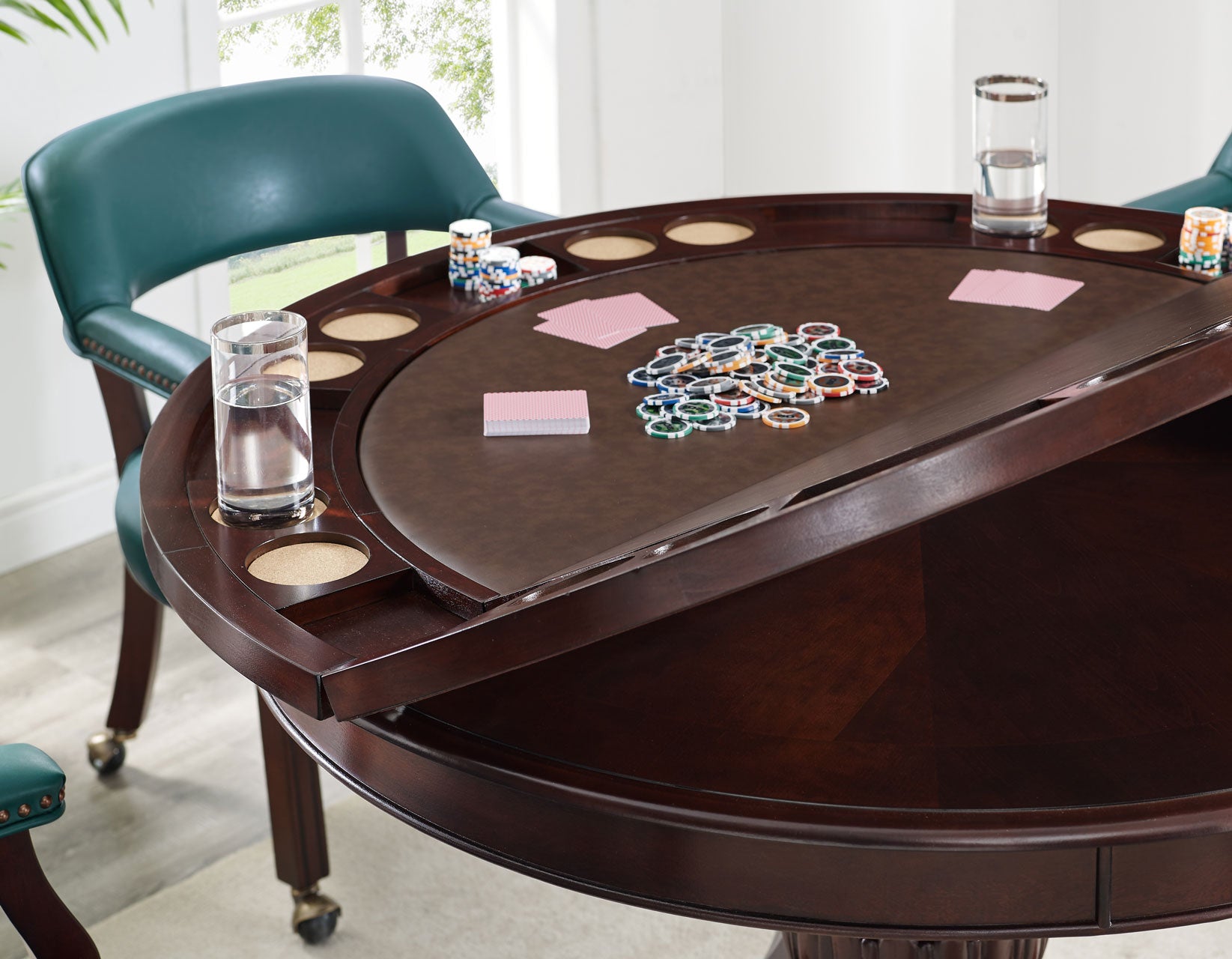 Enjoy both game night and dining night with this game table and chairs set. The 48-inch round table comes in a medium cherry finish and can accommodate four comfortably for dining. The game table easily converts to a game table with the addition of the game table top that is available in brown faux-leather (as shown) or black faux-leather. The game top folds and stores easily and the table goes back to a dining table. The upholstered Captain’s Chair is castered for easy mobility and comes in a wide range of colors perfect for every decor.