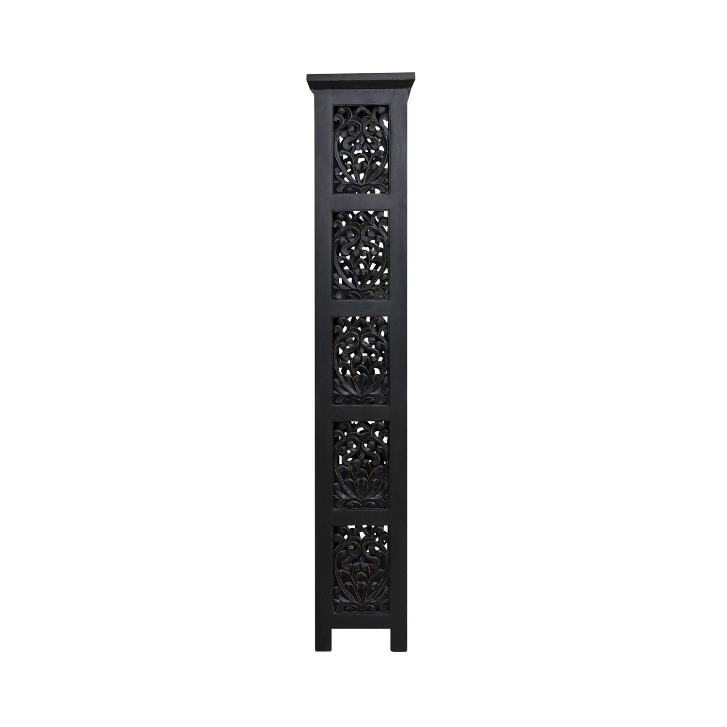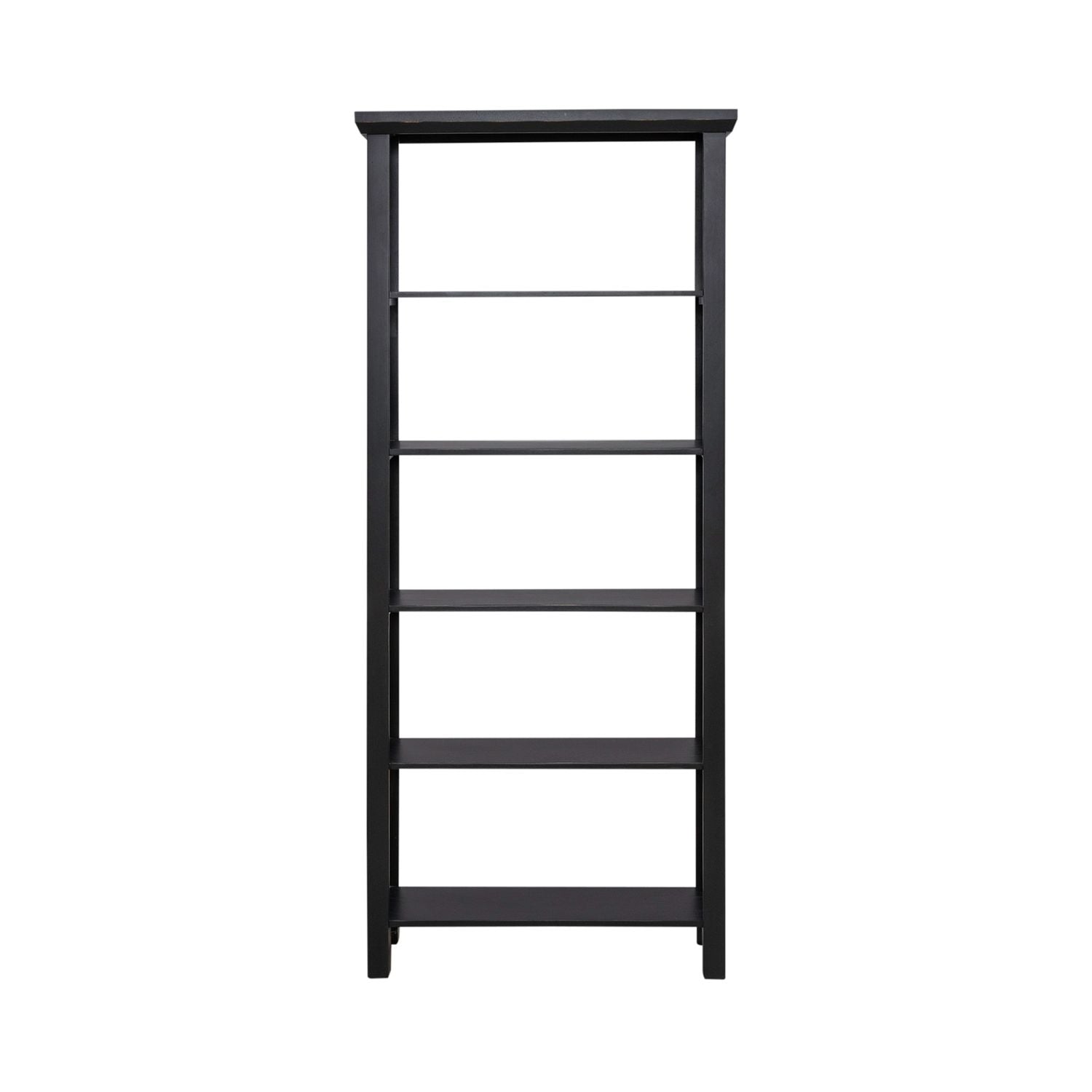 Accent your space with the one-of-a-kind Trellis Lane accent bookcase. Crafted of solid mango, this piece features a Weathered Black finish with brown rub thru, artisan hand carved end panels, five shelves of storage, and is anchored by block legs. This timeless bookcase will make a wonderful addition to your traditionally styled home. Add the accent writing desk and chair to complete your look.