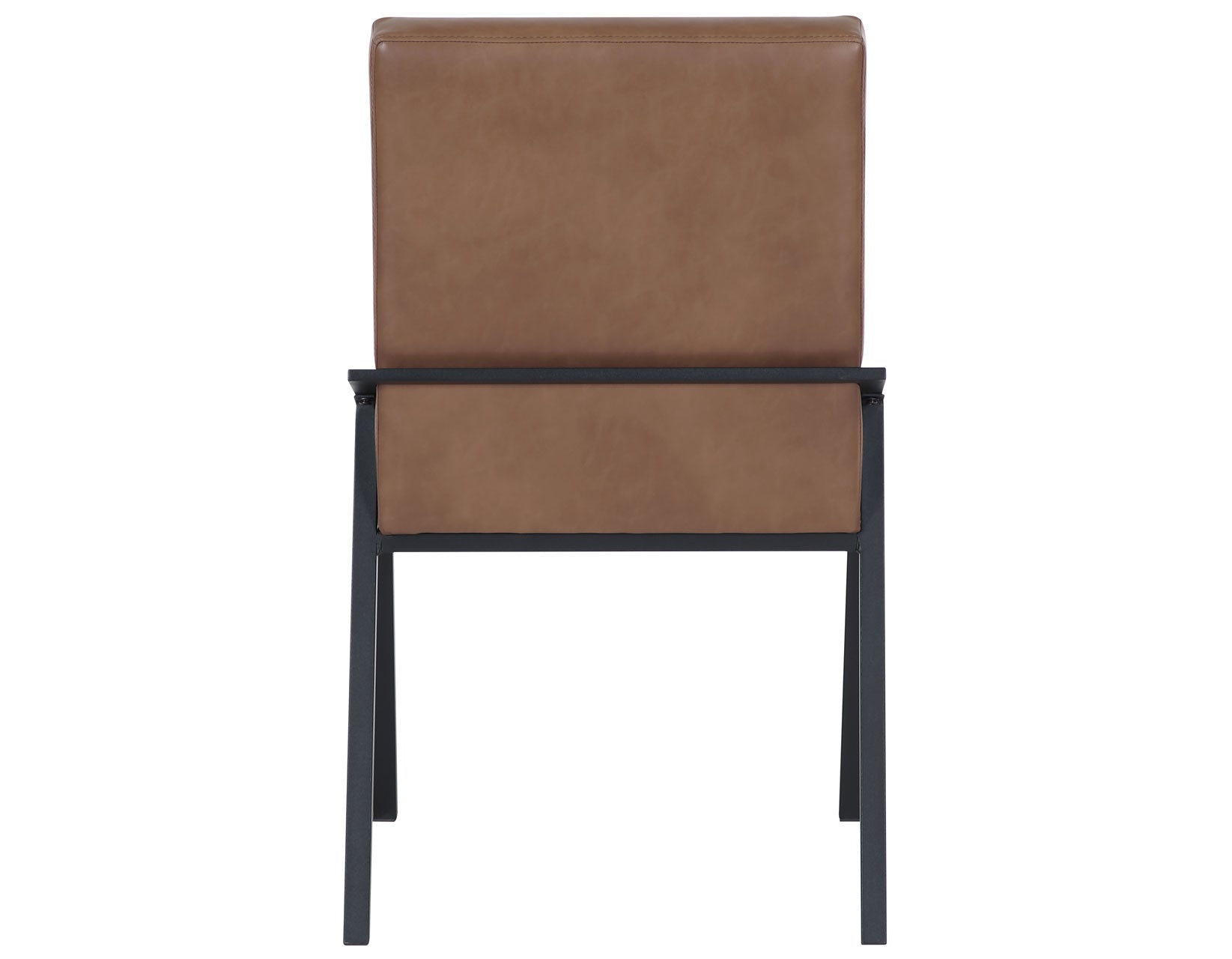 A modern mixed-media marvel, the Tucson Side Chair delivers all-day comfort with versatile appeal for dining rooms, home offices, or living spaces. Upholstered in camel-colored vegan leather, the seat is generously cushioned with 1.1-density foam for exceptional comfort. The sleek black powder-coated iron base adds durability and a contemporary edge, creating a stylish contrast that elevates any setting.