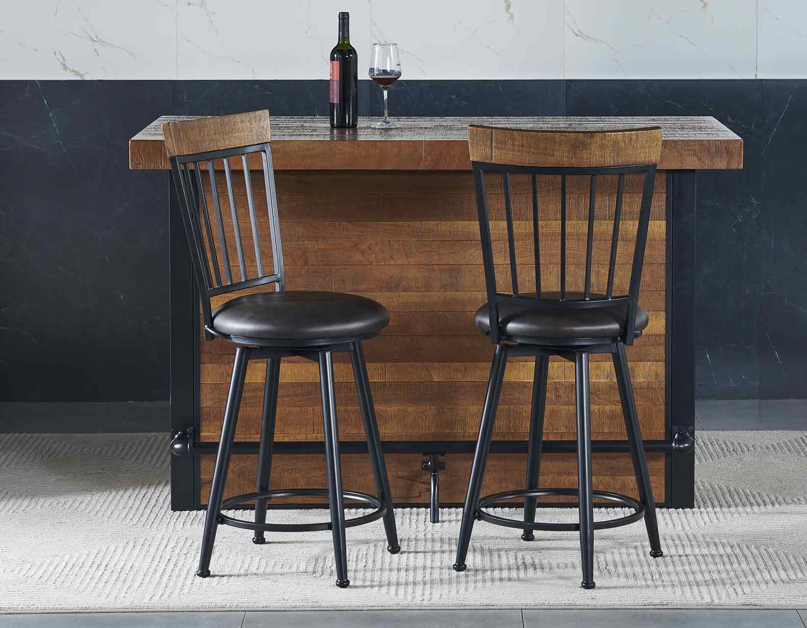 Sturdy and rustic, the Tyler 38-inch Bar Set delivers a slice of nostalgia mixed with a casual and relaxed design.A glowing rustic Chestnut finish highlights the grain and character of the birch veneers in a distressed application that beautifully accents the powder-coated ebony metal. Storage abounds in the back of the bar for all your serving needs including a hanging stemware rack. The Tyler Counter Stool offers 360 degree swivel with a padded, easy-care black leatherette seat that cleans with the wipe of a damp cloth. Comfort, style and organization…all delivered with the Tyler Counter Bar Set.