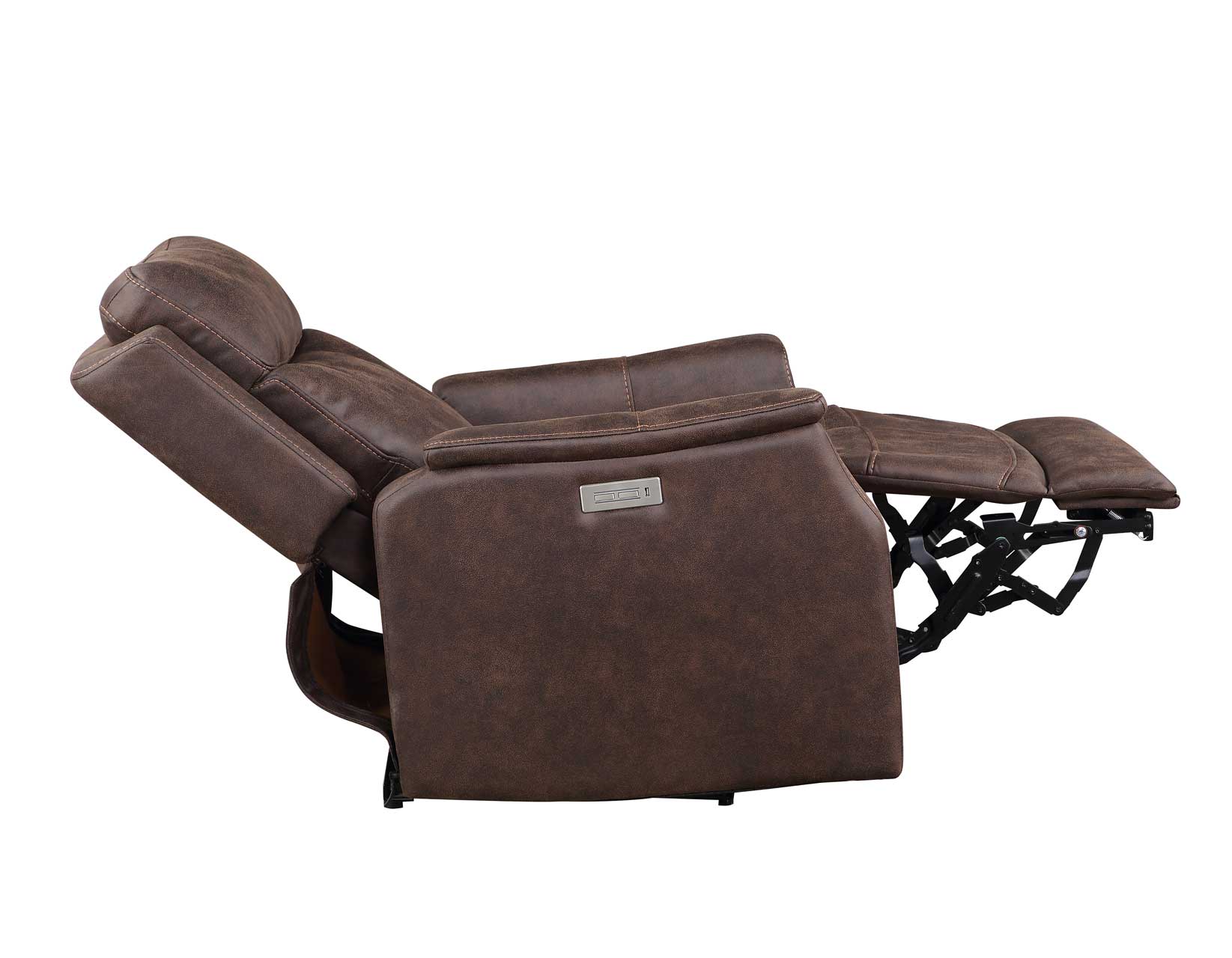 The Valencia Dual-Power Recliner adds clean contemporary styling to reclining comfort in this functional compact chair. The warm walnut leatherette cover has the appearance and texture of a Nubuck leather application without all the maintenance in this easy-care application. Power footrest and power headrest allow perfect positioning of the chair for comfort and operate at the touch of a button. A handy USB charging port ensures you won’t have to leave your seat to charge any devices.