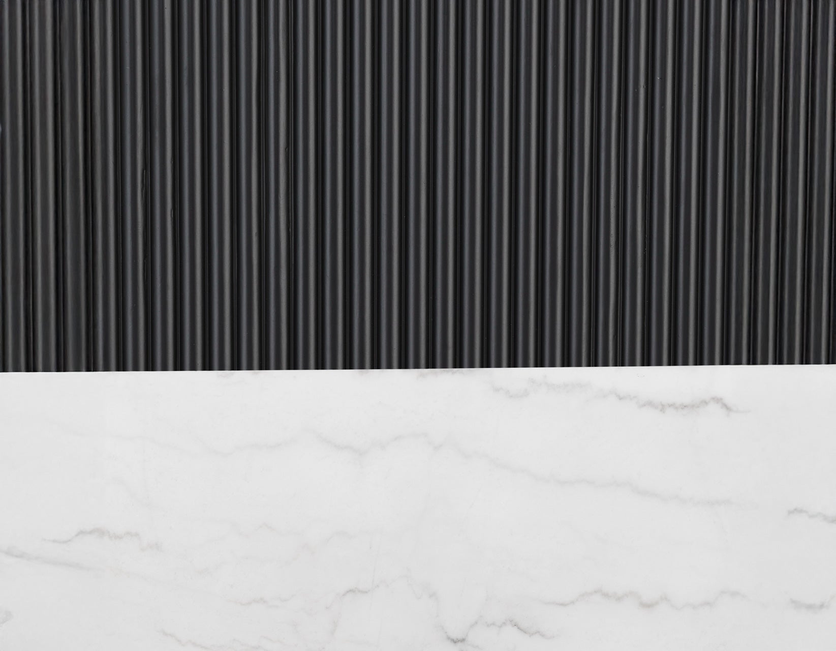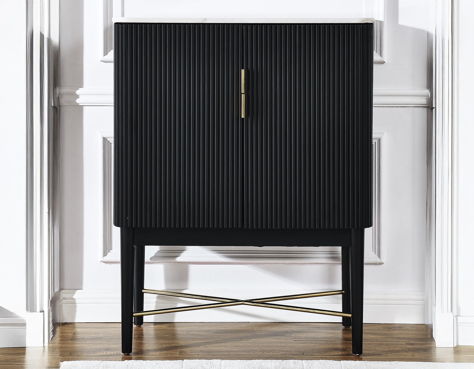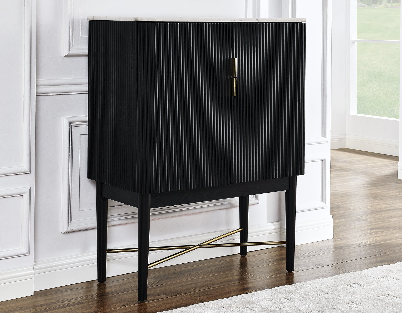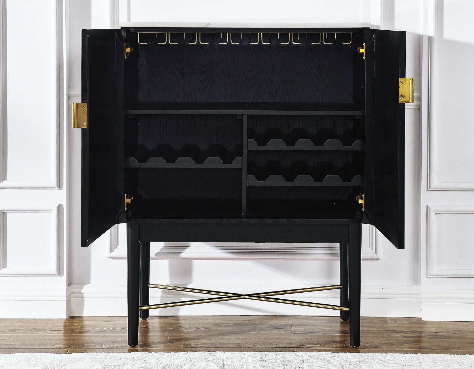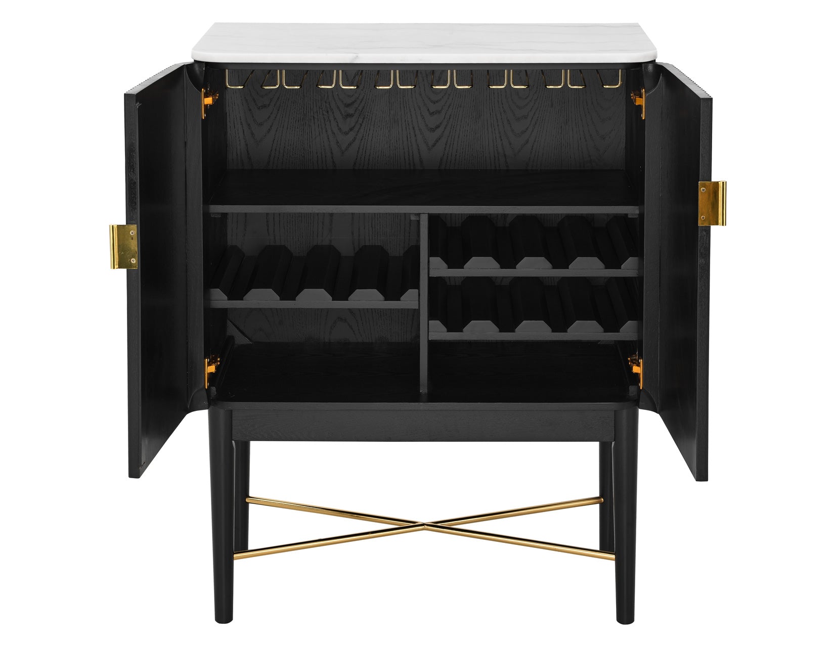 The Vida Black Wine Cabinet with Marble Top exudes art deco flair and old Hollywood glamor, offering elegant dining room storage. Its reeded black-finished doors with gently curved corners bring a refined touch to this functional piece. Inside, adjustable wine rack shelves hold up to 12 bottles for a stunning display, while hanging stemware storage adds to its charm. The sleek black finish, brass hardware, and luxurious marble top come together to create a chic storage solution that elevates any dining space with style and sophistication.