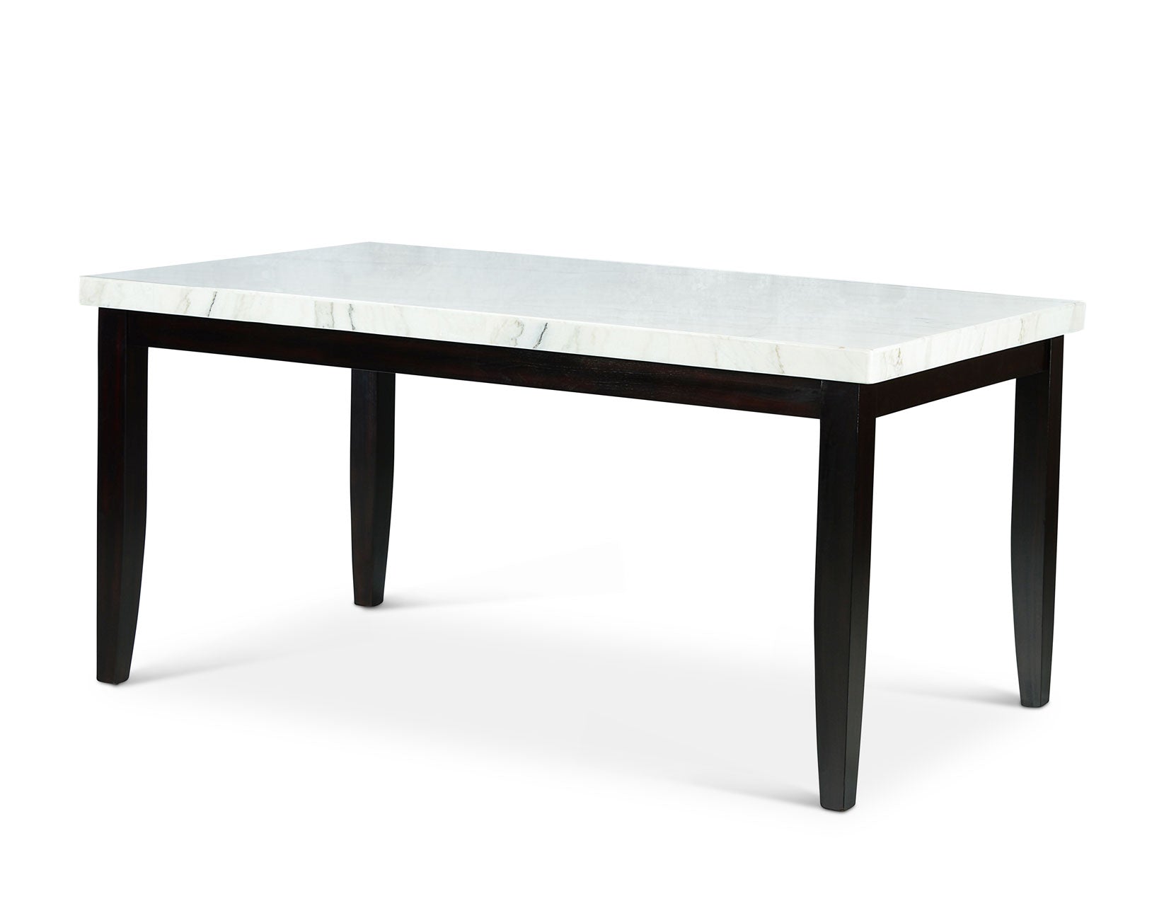 A modern take on dining, the Westby features a stunning white marble top with hints of black mineral accents that coordinates beautifully with the ebony pewter nailhead trim chairs and bench.