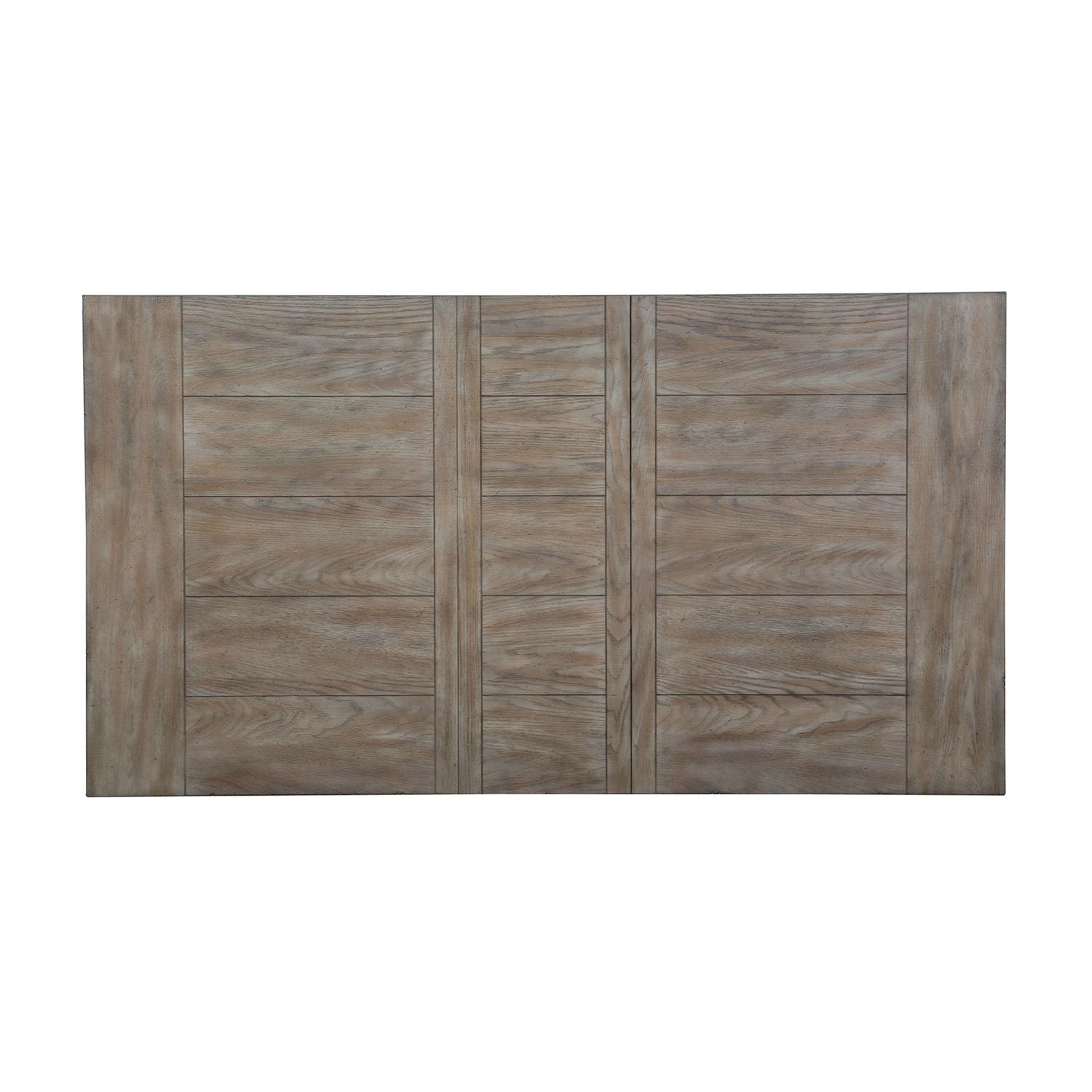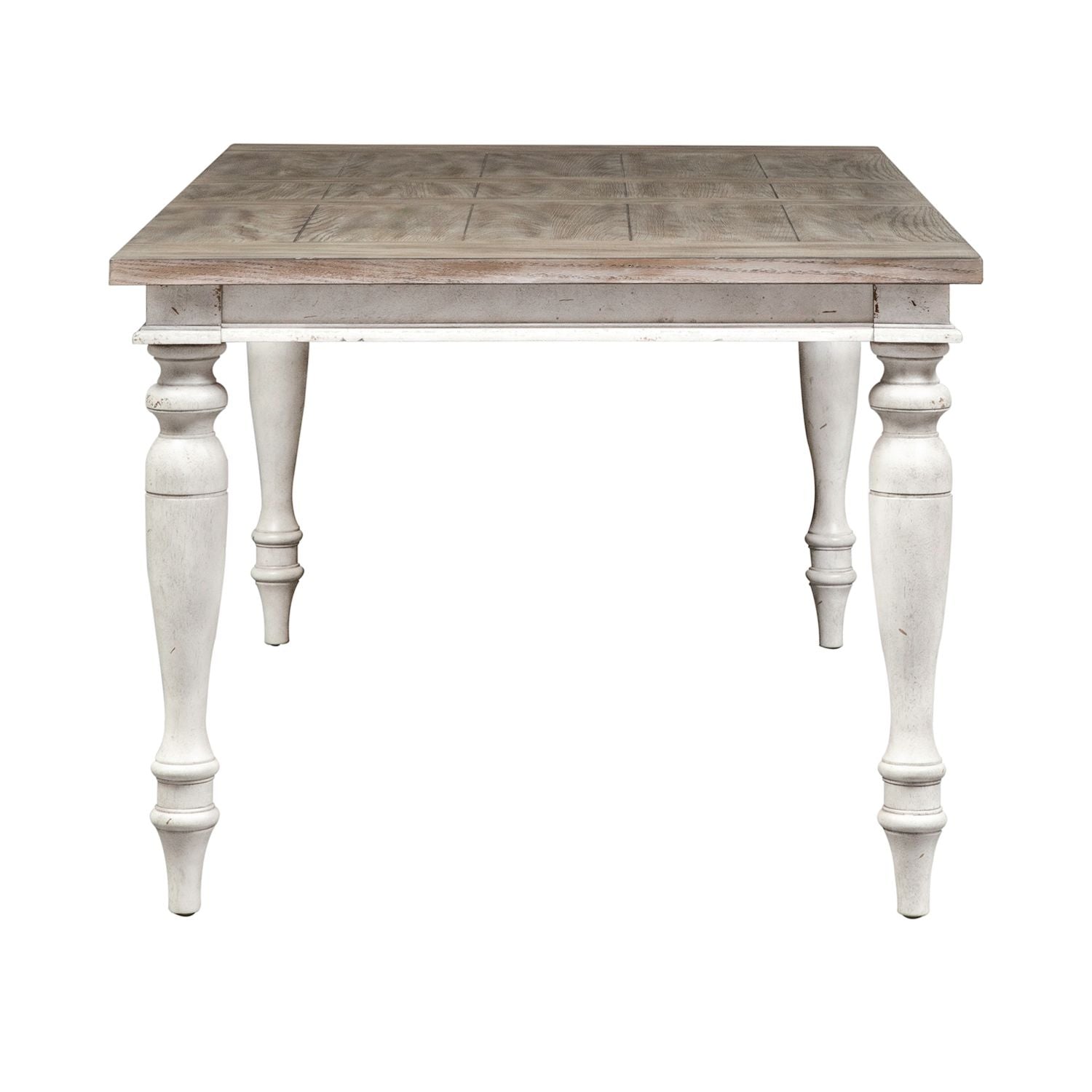 Gather around the Whitney rectangular leg table. Crafted of rubberwood solids and oak veneers, this piece features an English country charm, one 14 inch leaf to accommodate guests or a larger family, planked top, and is anchored by heavily turned legs. The antique linen and weathered gray finish gives this group an heirloom appeal.