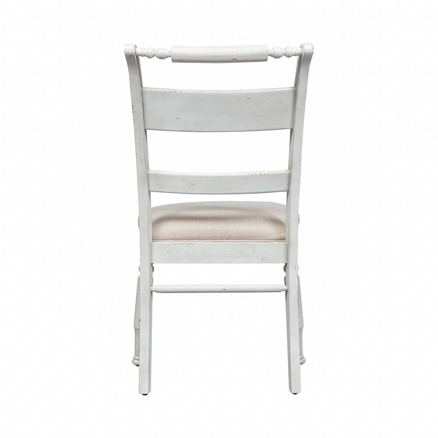 Sit in comfort and style with the Whitney slat back side chair. Crafted of rubberwood solids, this piece features English country charm, linen upholstery, turned cap rail, nylon chair glides to protect your flooring, and is anchored by beautifully turned front legs. The antique linen and weathered gray finish gives this group and heirloom appeal.