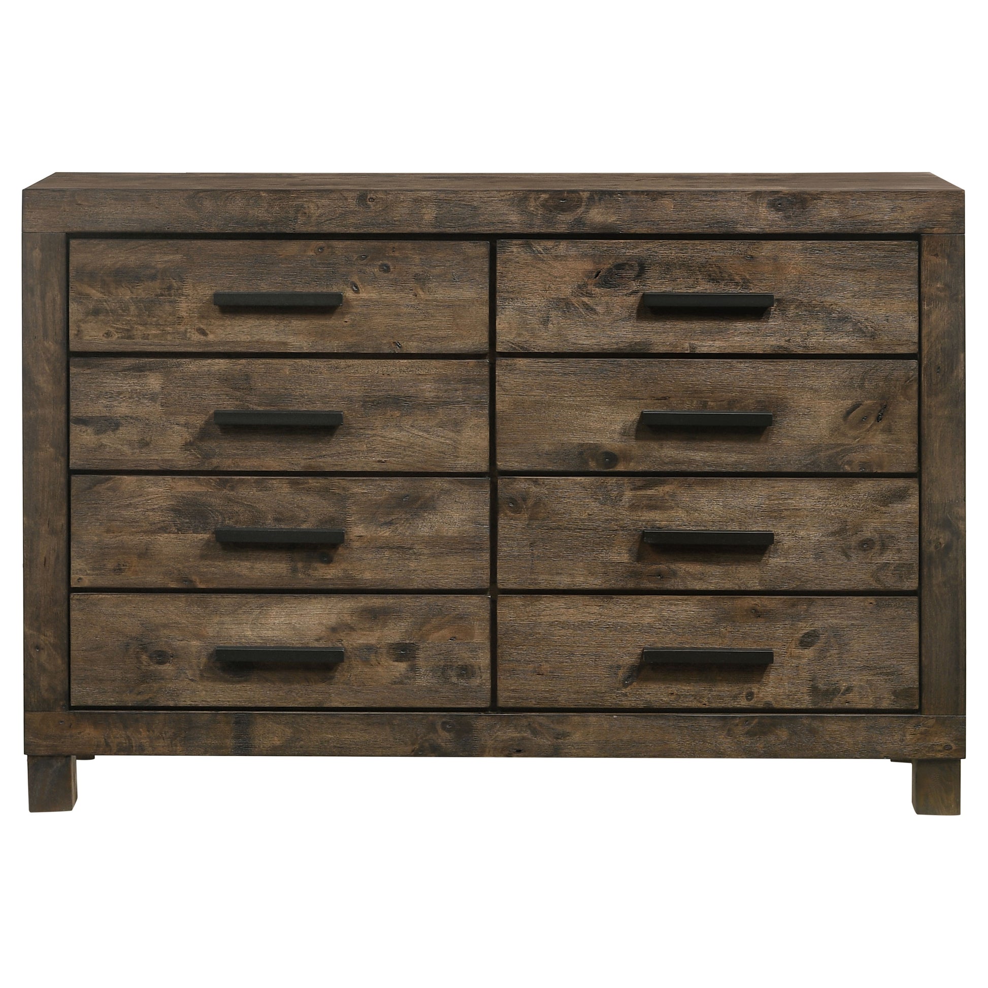 Bring warmth and character to your bedroom with the Woodmont set, crafted with a rustic golden brown matte finish and wire-brushed wood grain details. Solid block legs and sturdy construction ensure durability, while wooden bar handles add rugged charm. Ample storage drawers and functional design elements keep essentials organized with ease. This versatile bedroom set balances rustic elegance and practical function, creating a timeless centerpiece for your space.