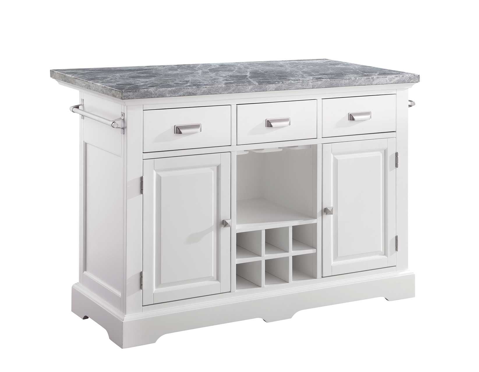 Add seating and storage to your kitchen with the Zermatt Grey Marble Top Kitchen Island. Clean classic lines with the beveled door panels, bracket feet and nickel cup hardware pulls create a warm and inviting gathering piece. The white base and grey marble top offer a neutral palette to go with the many features including dual towel holders, bottle storage rack, hanging stemware rack and overhang shelf for counter seating.